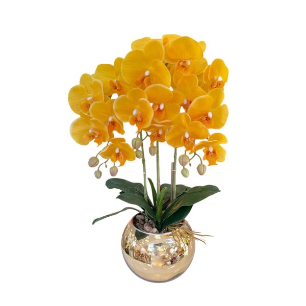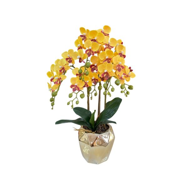Орхидея в жълт цвят със златна кашпa, 55см