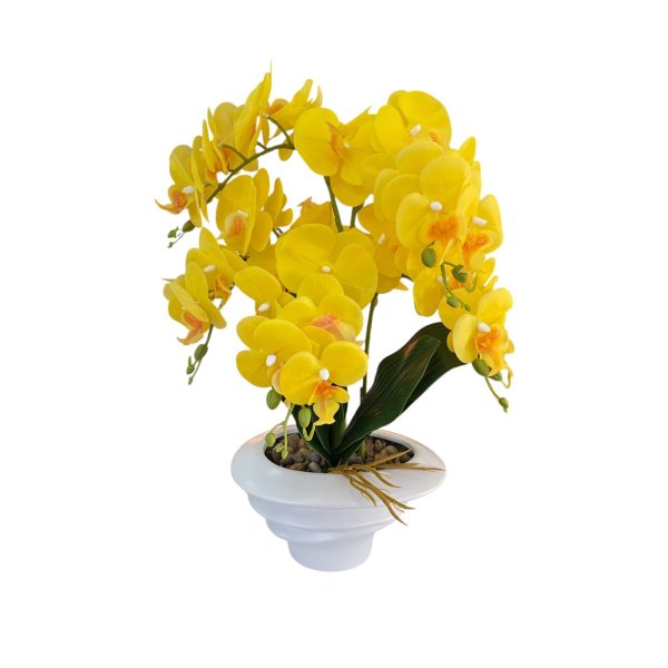 Орхидея в бял цвят с жълта релефна кашпа, 50см