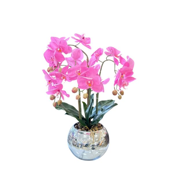 Орхидея в розов цвят със сребърна кашпa, 50см