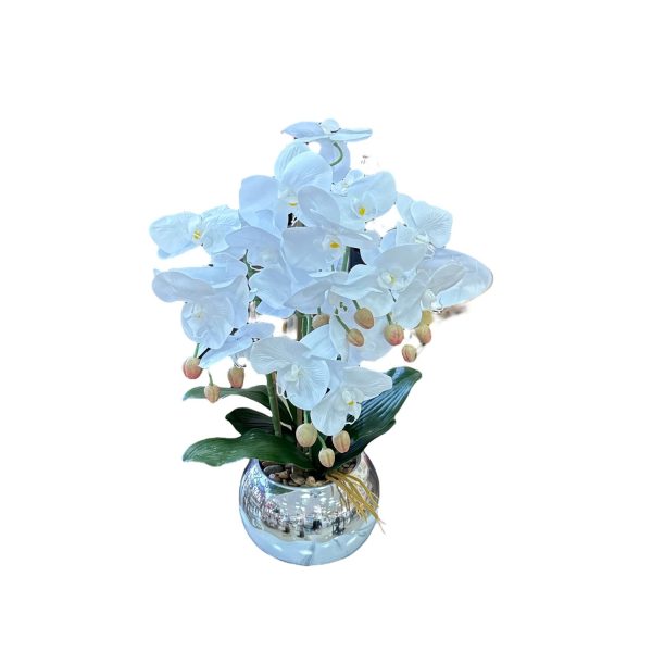 Орхидея в бял цвят със сребърна кашпa, 50см