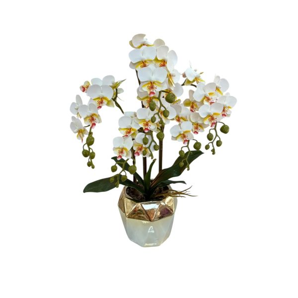 Орхидея в бял цвят със златна кашпa, 55см