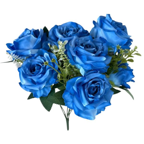 Букет от изкуствени сини рози с декоративна зеленина, 7 стръка