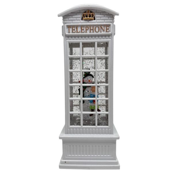 Музикална и светеща коледна декорация – въртящ се снежен човек в телефонна кабина