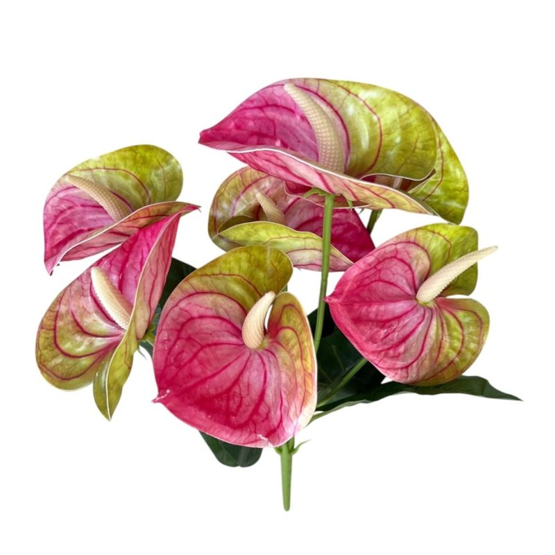 Тозии букет с антуриуми впечатлява с наситени розово-зелени нюанси и реалистична форма. Идеален избор за екзотичен акцент във вашия дом, офис или събитие.