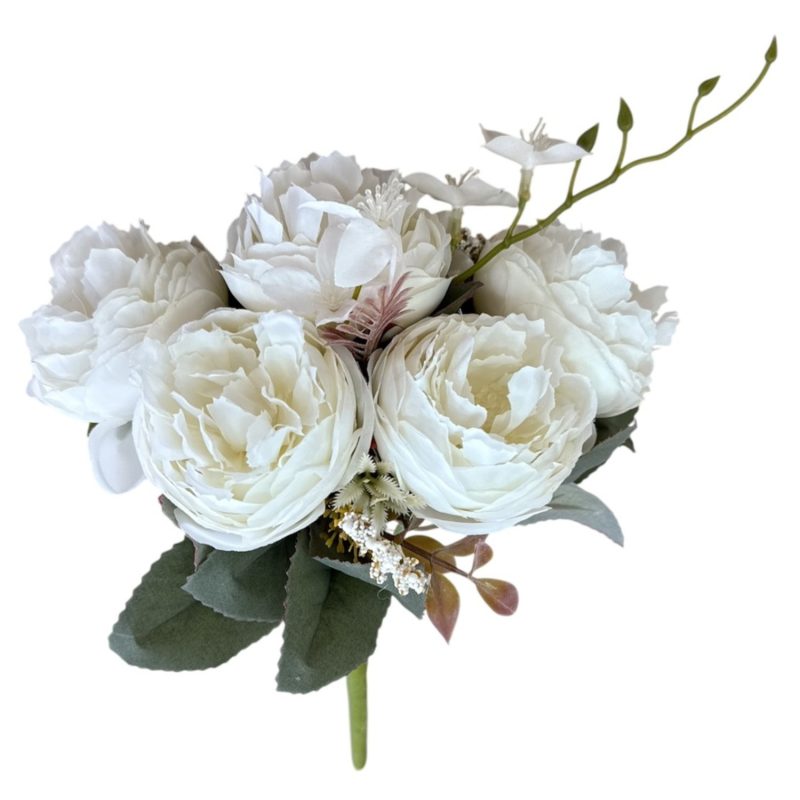 Елегантен букет от бели изкуствени цветя, комбиниращ божури, рози и декоративна зеленина – идеален за сватбена декорация, фотозони или дома.