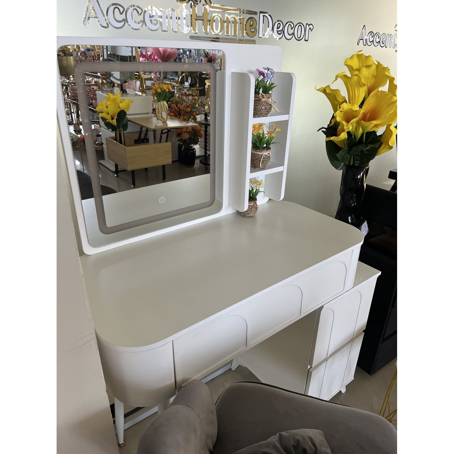 Тоалетка в нежен бял цвят, създадена да внесе изтънченост и уют във всяка спалня. Оборудвана с LED огледало с 3 степени на светлина и практични рафтчета, разположени вдясно, за лесен достъп до любимите козметични продукти и аксесоари. Комбинацията между функционалност и естетика прави тази тоалетка перфектен избор за жени, които ценят организацията, светлината и изисканите форми в интериора си. Към тоалетката е включен комод с 2 чекмеджета, който може да се инсталира от ляво или от дясно.