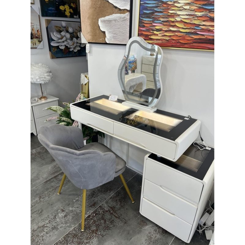 Дамска тоалетка, съчетаваща функционалност и стил. Плотът на тоалетката и комода е от темперирано стъкло с LED осветление. Бюрото е с 2 чекмеджета, а комодът с 3. Към тоалетката има LED огледалото с асиметрична форма, което свети в 3 степени. Тоалетката е от еко кожа в бял цвят, има опция за свързване с Bluetooth, зареждане с кабел и тонколона, от която може да слушате любимата си музика докато се гримирате.