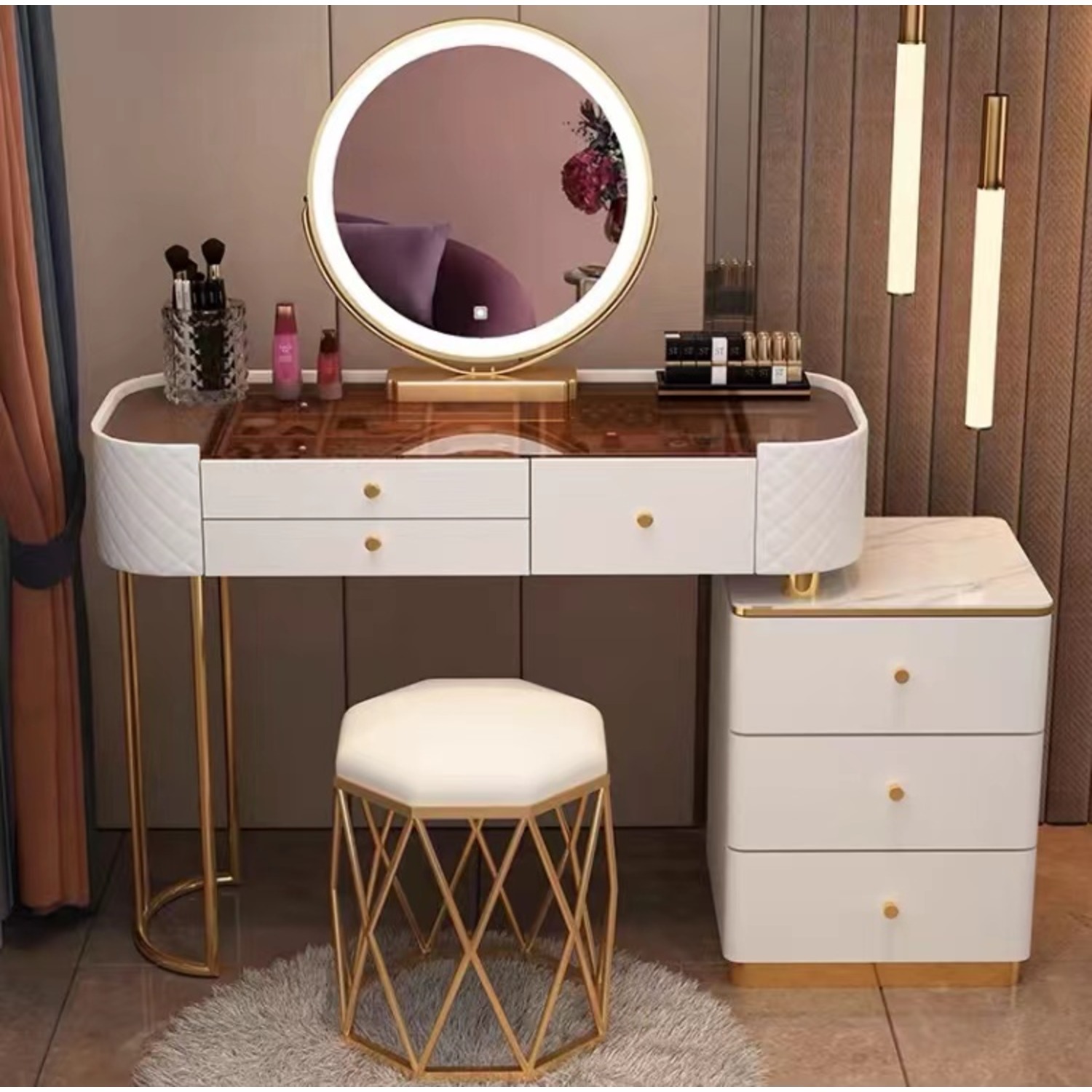 Елегантна и модерна тоалетка с кръгло LED огледало, удобни чекмеджета и стилен дизайн с бели и златисти акценти. Идеално допълнение за всяка стилна спалня или грим кът. Огледалото свети в 3 различни светлини – бяла, студена и комбинирана. Плотът на дамската тоалетка е от темперирано стъкло. Плотът на комода е от МДФ и имитира мраморни елементи.