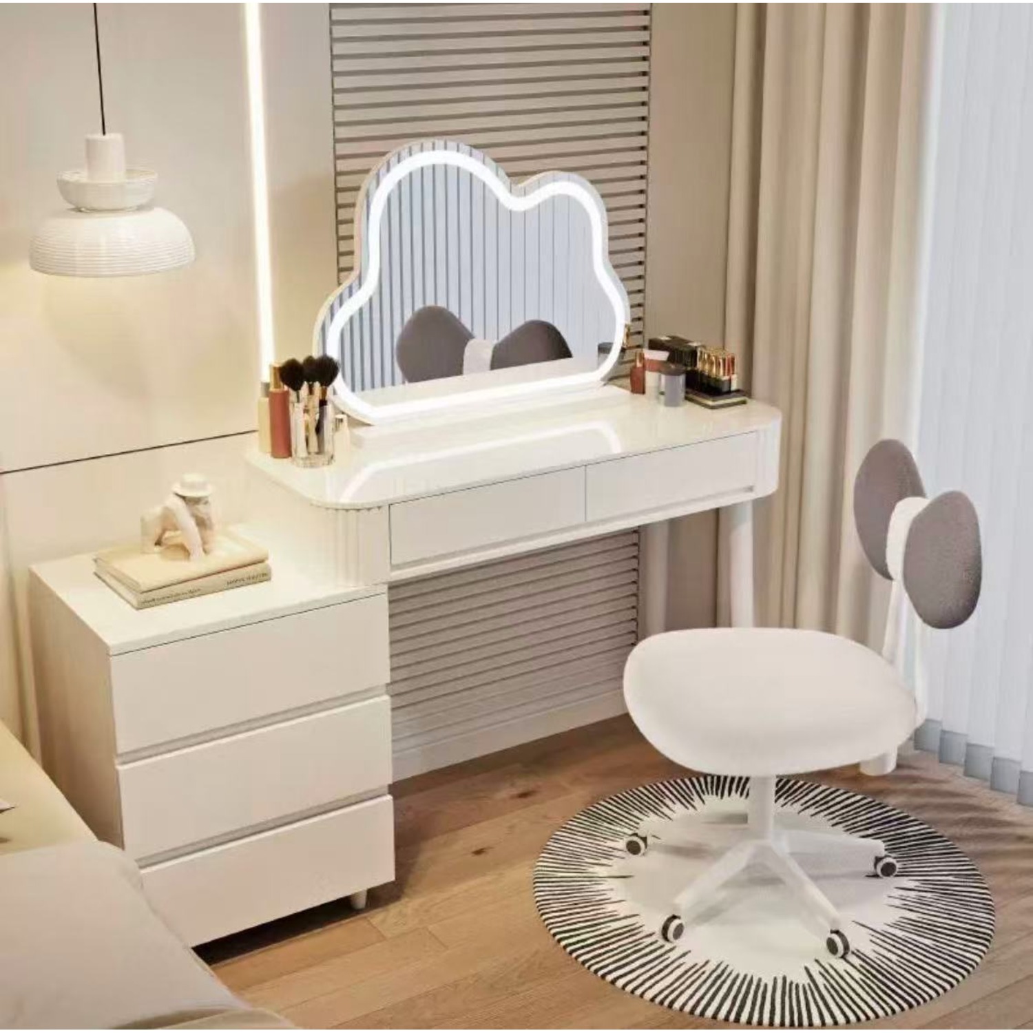 Дамска тоалетка в бял цвят с плот от технически камък имитиращ мраморни елементи. Тоалетката е с 2 чекмеджета, а комодът с 3, който може да се инсталира от ляво или от дясно. Кръглото LED огледало е в бял цвят и е с регулируема светлина, която осигурява идеално осветление за грим и ежедневна грижа.