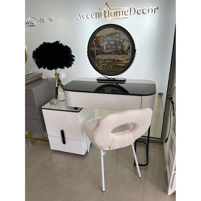 Дамска тоалетка в бял цвят и черно темперирано стъкло на плота. Тоалетката е с 1 чекмедже. Към нея има комод в бял цвят с 2 чекмеджета, който може да се инсталира от ляво или от дясно. Дизайнът на плота на комода имитира мраморни елементи. Кръглото LED огледало с регулируема светлина осигурява идеално осветление за грим и ежедневна грижа.