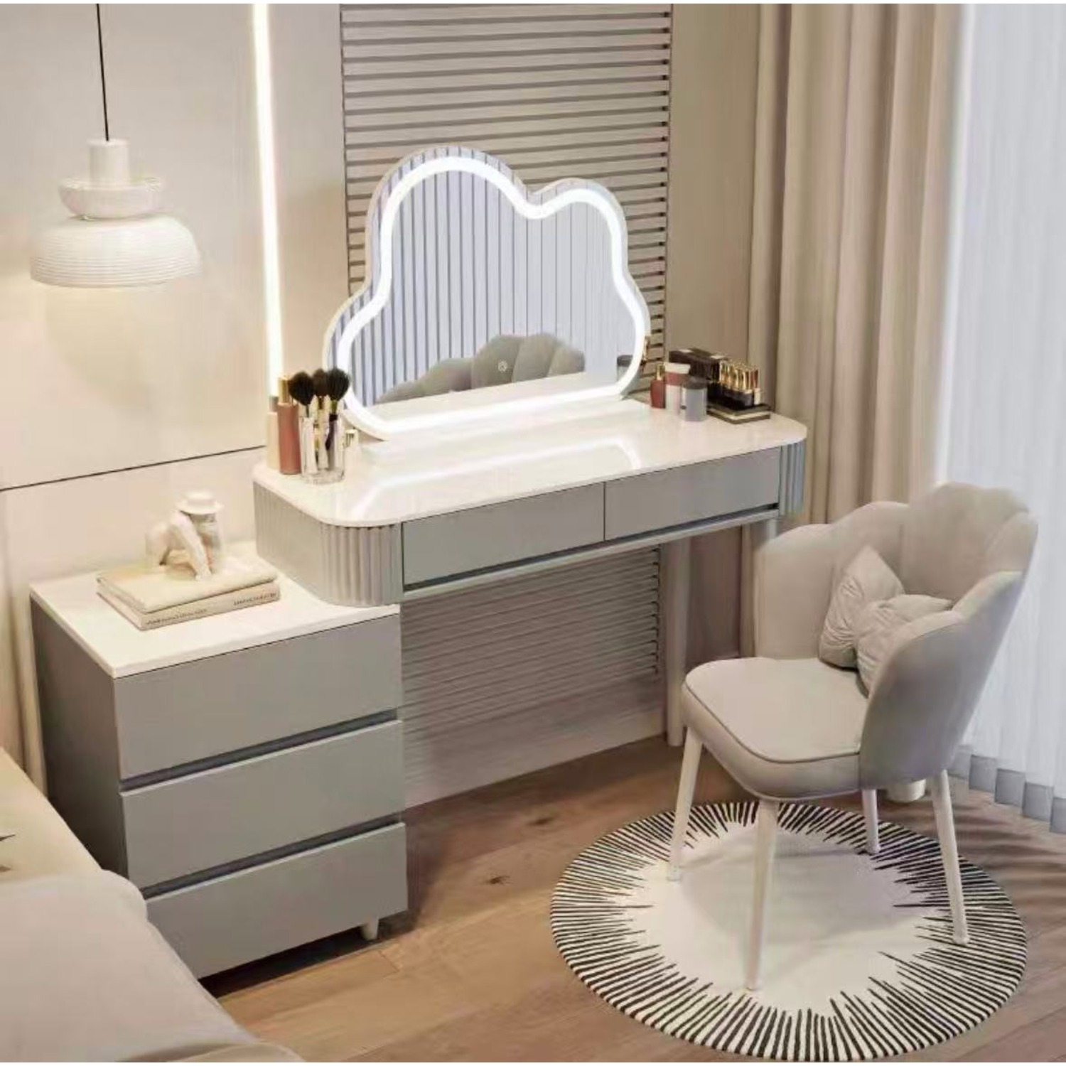 Дамска тоалетка в сив цвят с плот от технически камък имитиращ мраморни елементи. Тоалетката е с 2 чекмеджета, а комодът с 3, който може да се инсталира от ляво или от дясно. Кръглото LED огледало е в бял цвят и е с регулируема светлина, която осигурява идеално осветление за грим и ежедневна грижа.