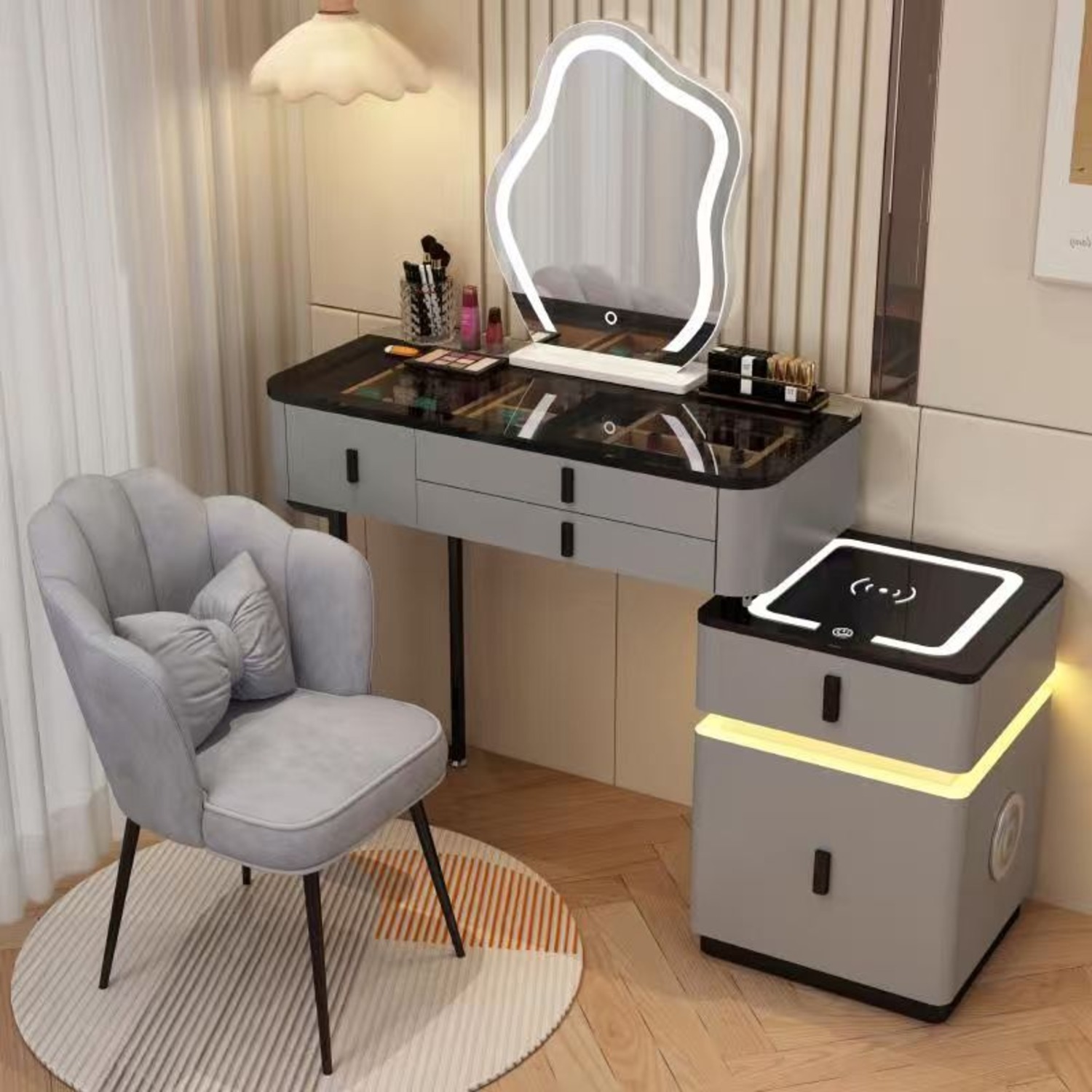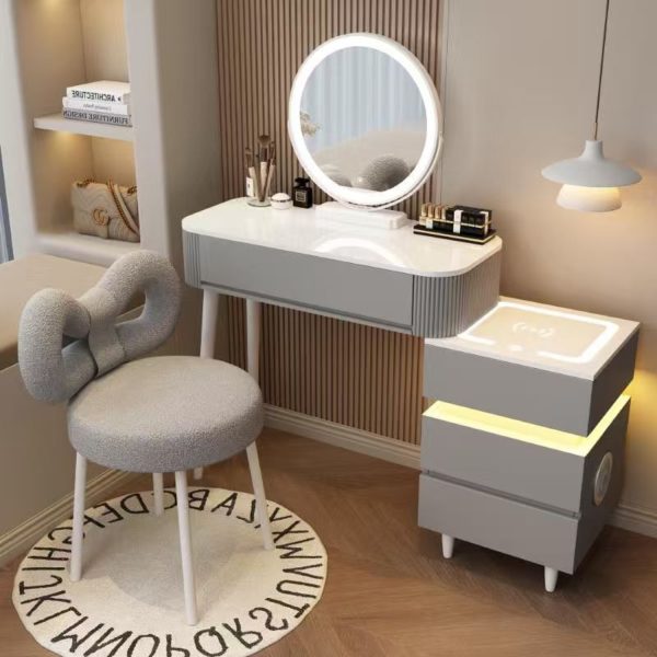 Дамска тоалетка в сив цвят, с плот от черно темперирано стъкло. Тоалетката е с 3 чекмеджета, а комодът с 2. Вградените Bluetooth и тонколона позволяват да слушате музика, докато се приготвяте. Има опция за безжично зареждане и място за зареждане на телефон с кабел, които добавят практично удобство в ежедневието. Комодът е осветен с елегантна LED лента, която подчертава модерната визия и създава уютна атмосфера. Mоже да се инсталира от ляво или от дясно. Към тоалетката е включено LED огледало с регулируема светлина, която осигурява идеално осветление за грим и ежедневна грижа.