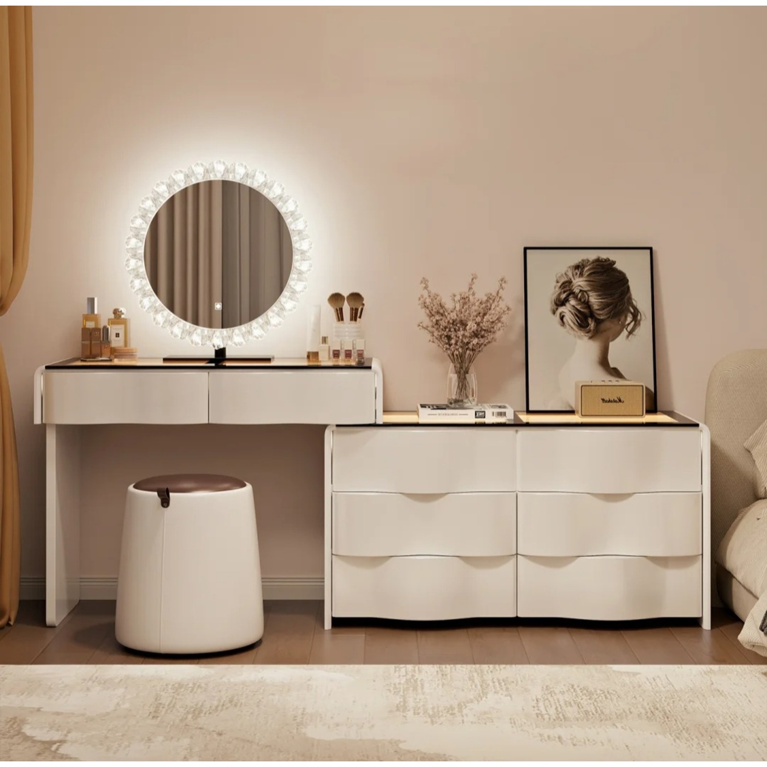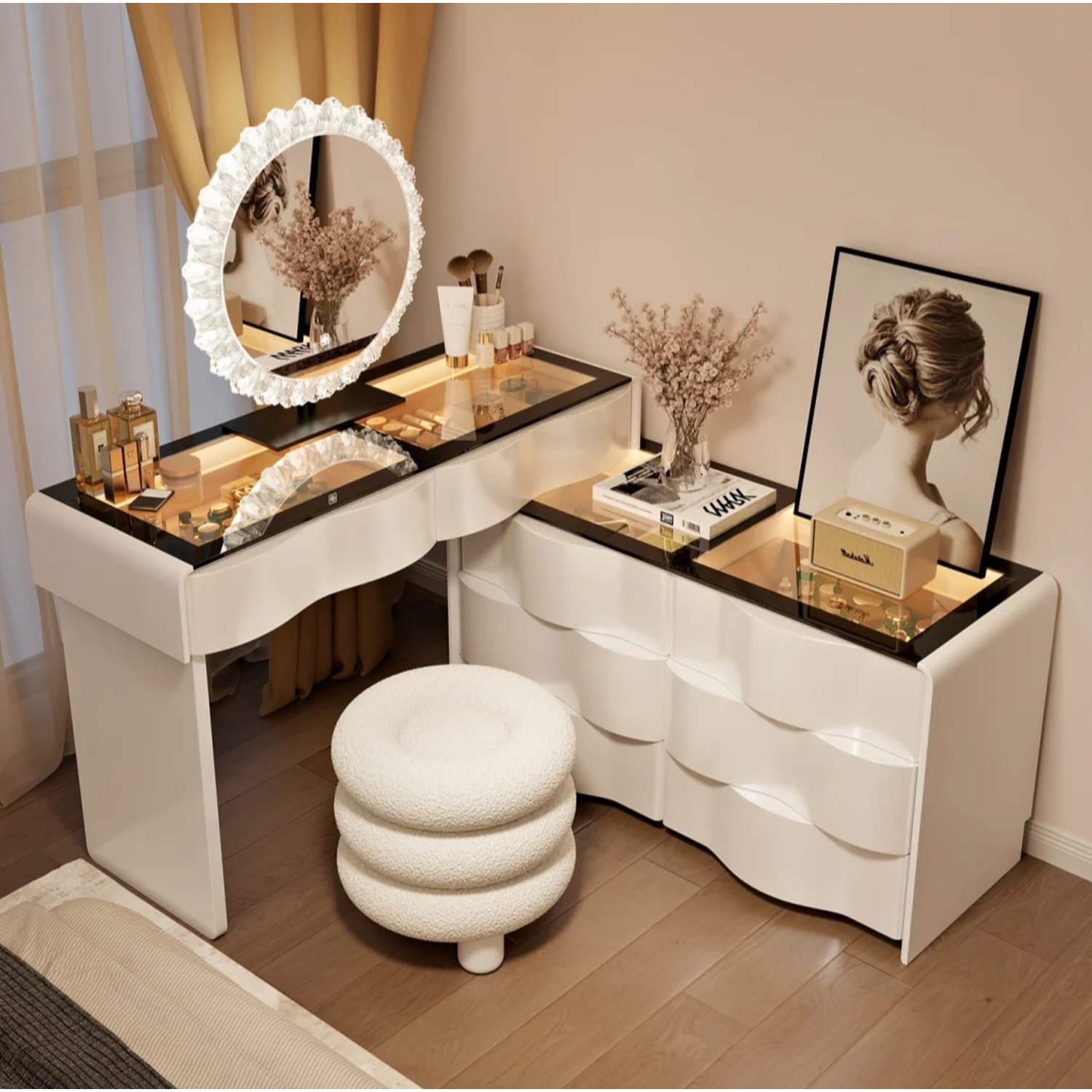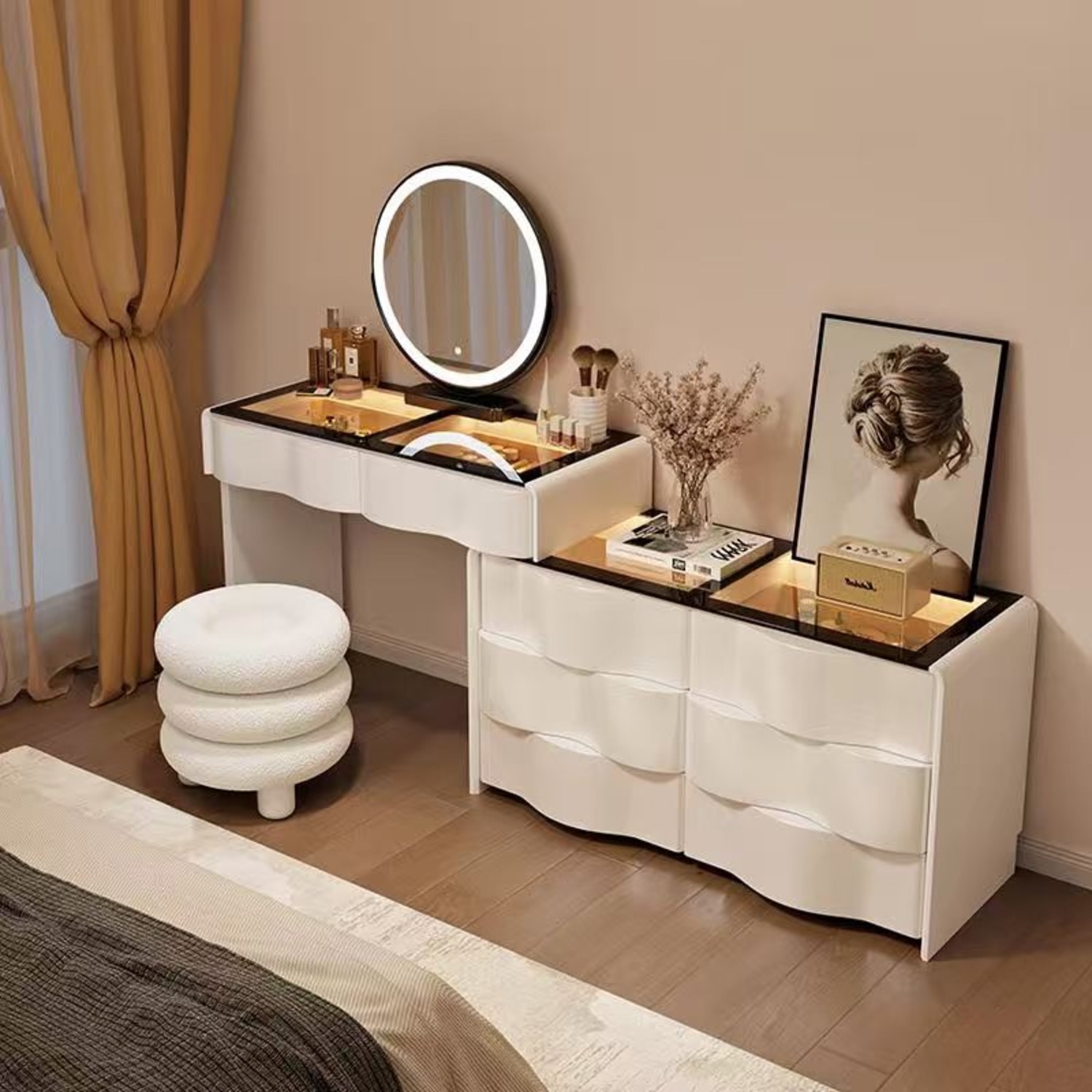 Елегантна дамска тоалетка с вълнообрачен дизайн в бял цвят, с кръгло LED огледало, което осигурява идеална светлина за грим и ежедневна грижа. Стъкленият плот придава луксозен и изискан вид, като същевременно позволява да се виждат подредените аксесоари под него. Вграденият шкаф с LED осветление и страничните отделения осигуряват практично място за съхранение на козметика, бижута и принадлежности. Минималистичният дизайн и топлата светлина създават усещане за уют и модерна естетика във всяка спалня.