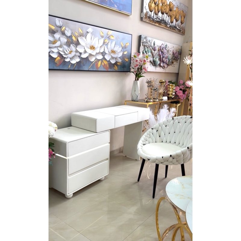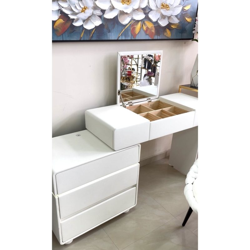 Модерна дамска тоалетка, съчетаваща стил и практичност. Повдигащото се огледало може да се прибира, което я превръща в мултифункционална мебел – подходяща и като бюро. В комплекта е включен и комод с три чекмеджета за удобно съхранение на козметика и аксесоари. Нежната LED лента с три степени на светлина осигурява комфорт при гримиране и добавя естетичен акцент към всяка спалня.