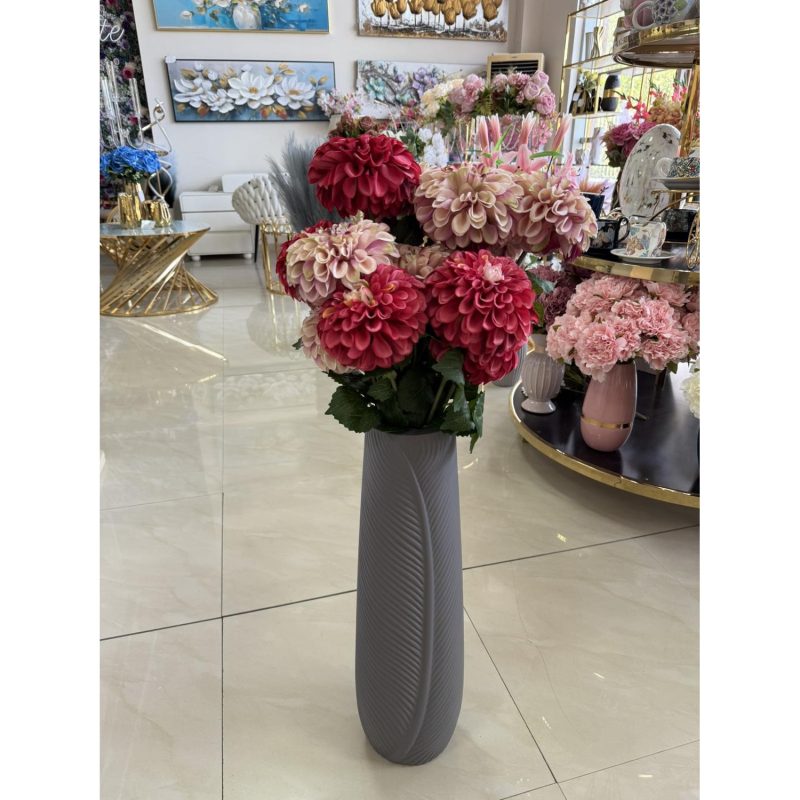 Елегантна ваза с издължена форма и ефектен релеф, която ще придаде стил и изисканост на всяко интериорно пространство. Семплият сив цвят я прави универсално допълнение към различни аранжировки и декори.