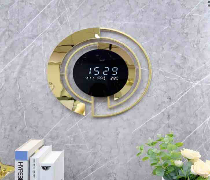Дигитален стенен часовник с диаметър 45см от метал в златен цвят с черен дисплей, показващ час, дата, градуси.