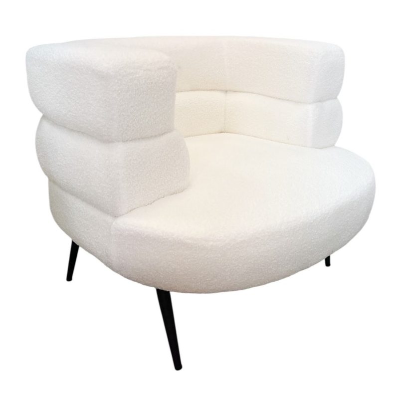 Добавете стил и уют към интериора си с този дизайнерски фотьойл в елегантно бяло букле. Нестандартната форма и комфортната облегалка го превръщат в акцентен елемент за всяка модерна всекидневна или спалня.