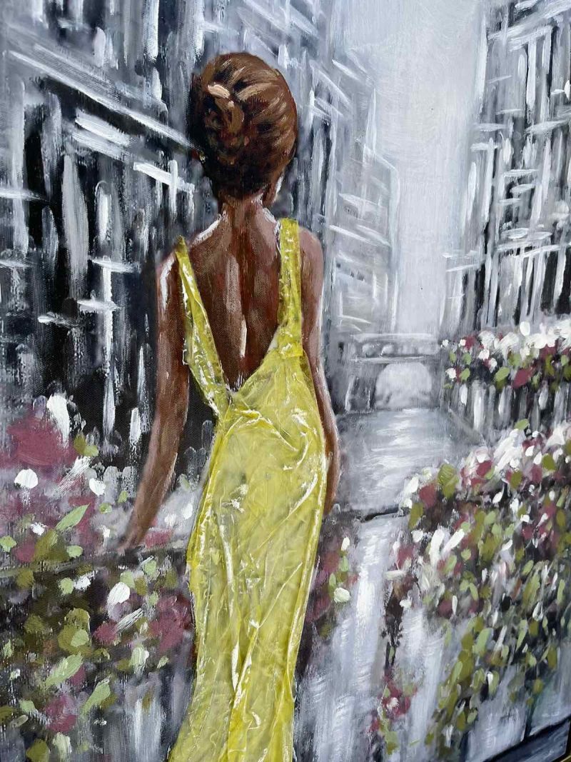 Картина изработена по технологията дигитално масло с ръчно наслоен релеф, изобразяваща жена с жълта рокля.Картината е стилен акцент подходящ за декор във всекидневна, спалня, както и за вашия хотел, или офис. Поръчайте за вас или като стилен подарък за всеки повод.