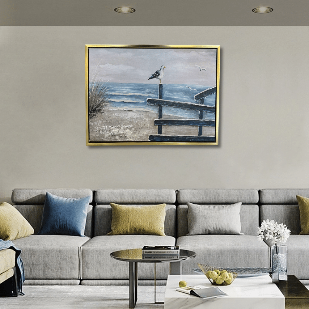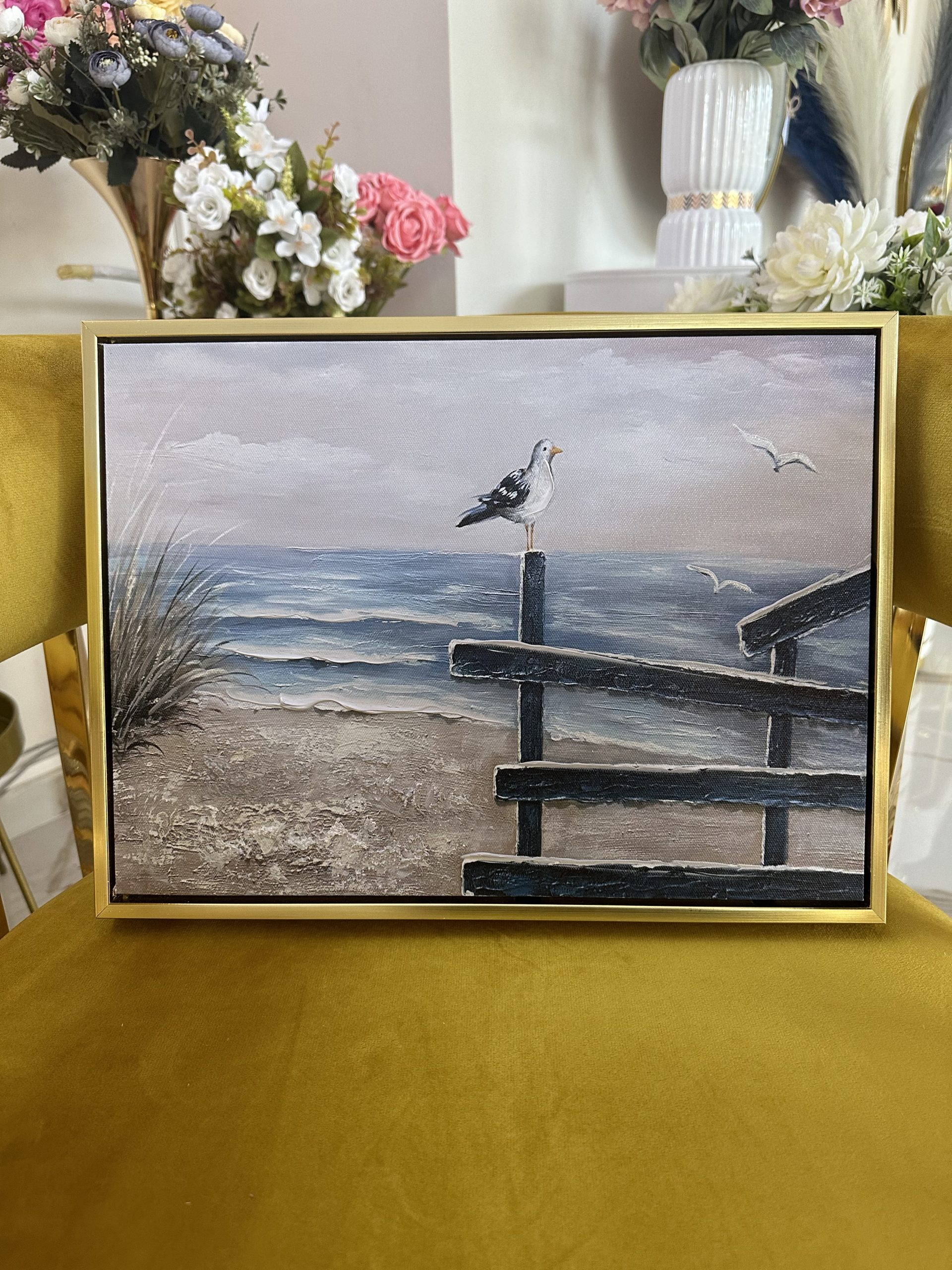 В първи план на композицията се вижда гларус, кацнал грациозно върху дървена ограда.Птицата е изобразена с впечатляваща детайлност – перата й са бели със сиви оттенъци, а очите й са внимателно насочени към морето, сякаш пази своята територия.Пясъкът е златист и мек, с няколко морски треви, разпилени по повърхността му. Вълните нежно се разбиват в брега, оставяйки след себе си линии от морска пяна. Водата е изобразена с различни нюанси на синьо, създавайки усещане за движение и дълбочина. Картината е изработена върху канава с маслени бои. Подходяща е за хол, антре, трапезария, спалня, офис или хотел.