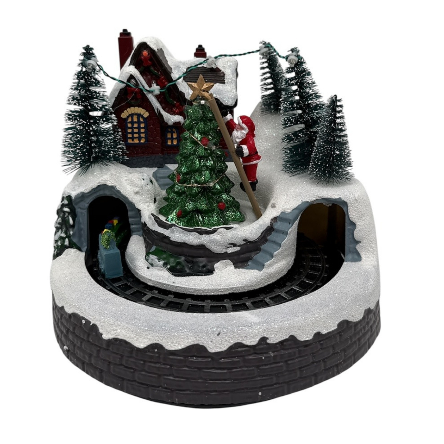 Коледна миниатюра с Дядо Коледа, украсяващ елха пред уютна зимна къщичка, заобиколена от снежни борове и влакче, преминаващо през тунел. Перфектен детайл за празничен уют.