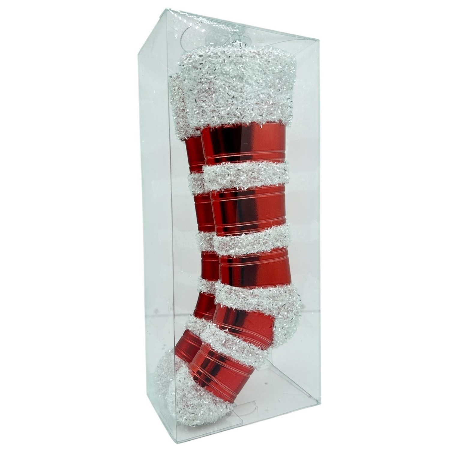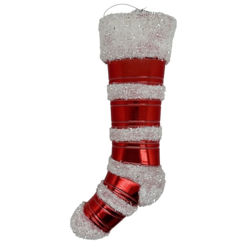 Ефектни коледни чорапи за закачане, съчетаващ класически червен цвят с блестящи бели ивици, наподобяващи сняг. Подходящ за декорация на елха, витрина, камина или стена.