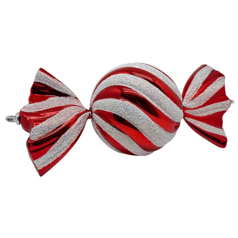 Забавна и ефектна висяща украса във формата на бонбонка с гланцово червено покритие и сребристи брокатени ленти. Идеален акцент за коледната елха или празнични аранжировки.
