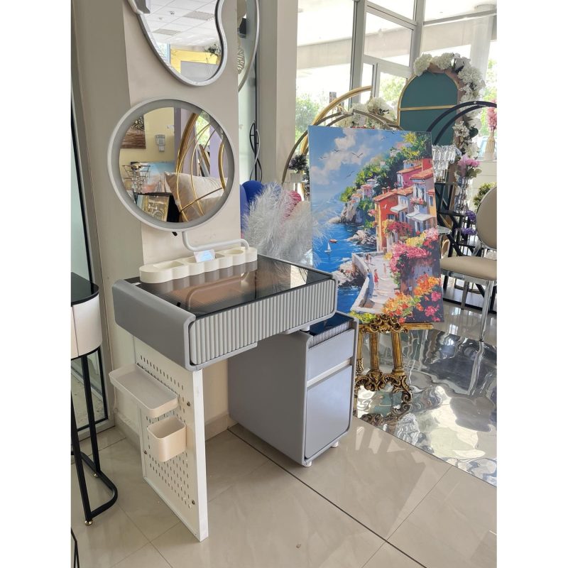Компактна дамска тоалетка в сив цвят с кръгло LED огледало, което осигурява идеална осветеност при гримиране. Стъкленият плот придава изискан вид и позволява лесно да подредите и виждате любимите си аксесоари. Отстрани има практични рафтчета и удобен шкаф с LED осветление за съхранение на козметика и принадлежности. Съчетава минималистичен дизайн, стил и комфорт – идеален акцент за всяка модерна спалня.
