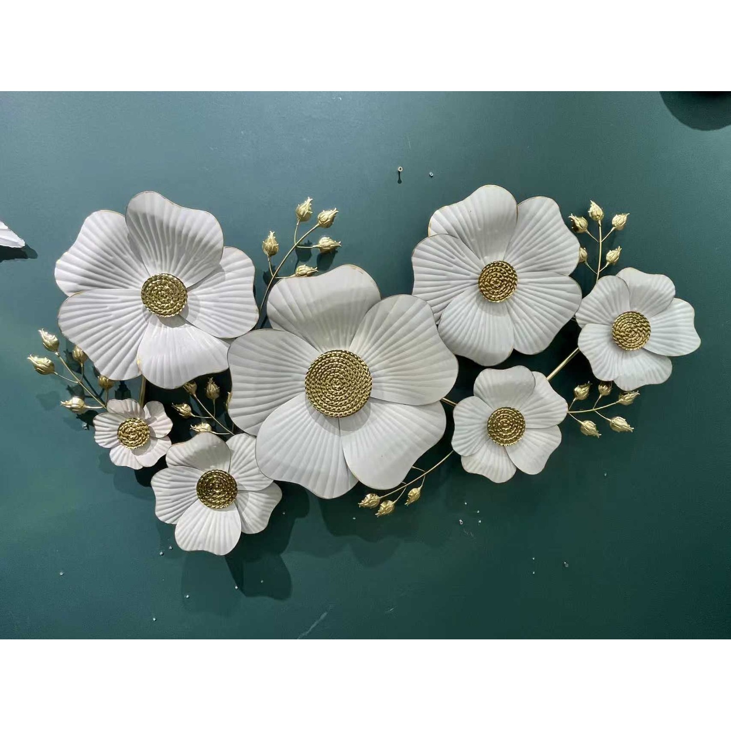 Тази изискана метална стенна декорация впечатлява с големи бели цветя в 3D форма и фини златни елементи. Релефните венчелистчета и златистите центрове създават деликатен, но луксозен ефект, подходящ за модерен и романтичен интериор – хол, спалня, коридор или бутиково пространство.