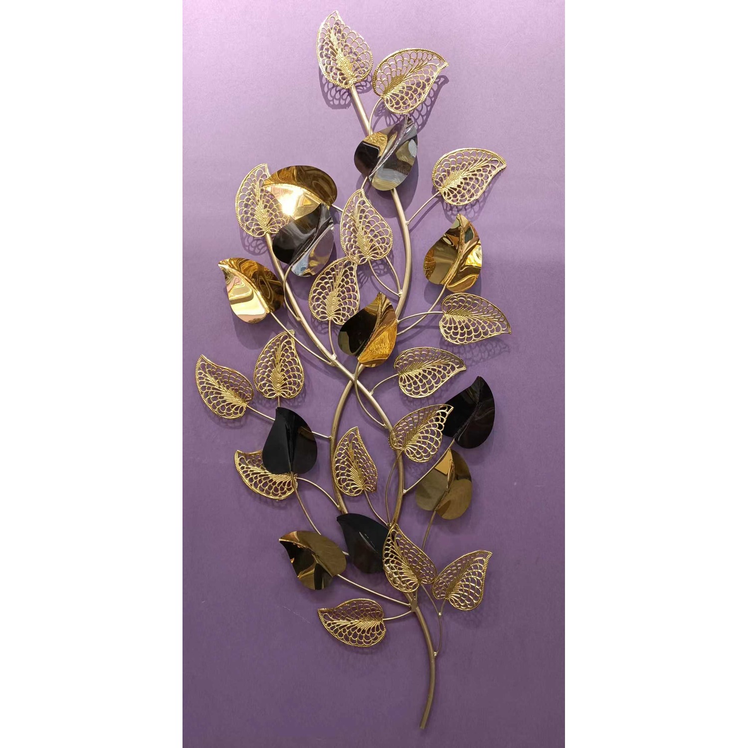 Тази елегантна метална декорация за стена комбинира ефектни златни и огледални листа с фина филигранна изработка. Дизайнът е вдъхновен от естествени форми на листа и придава луксозен акцент на всеки модерен интериор – хол, спалня, коридор или офис.