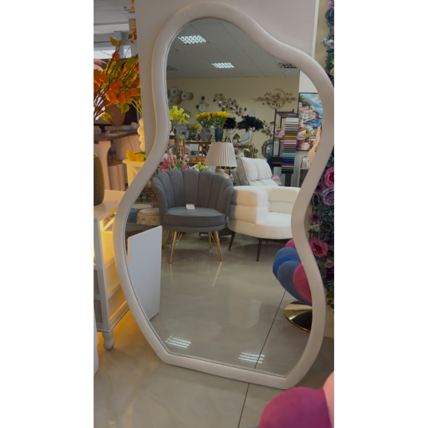 Елегантно огледало с извита форма и бяла рамка. Стилен и практичен аксесоар за всяко помещение. Широчина 100см, височина 160см.