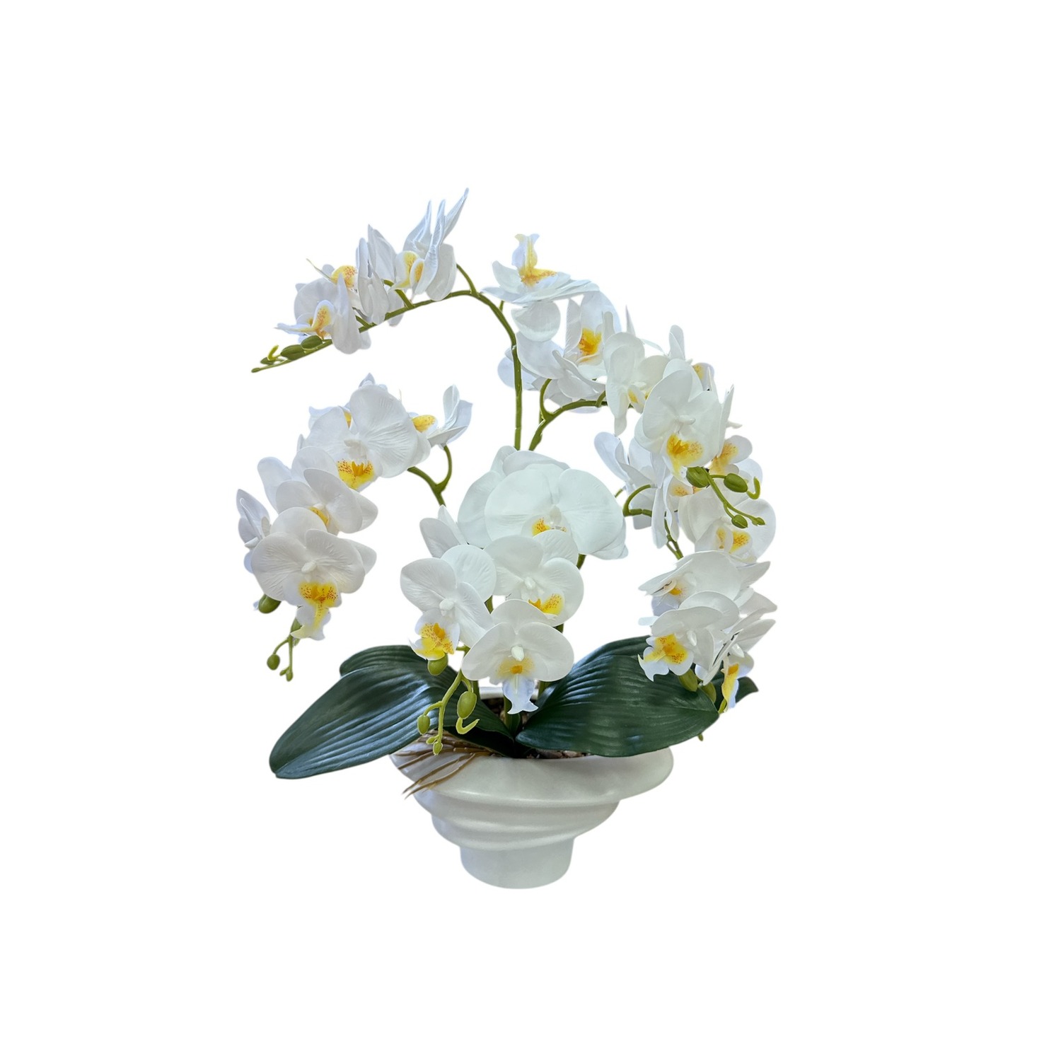 Елегантна изкуствена орхидея в бял цвят с 5 стръка оформена в модерна бяла керамична кашпа с релефен дизайн. Идеален акцент за стилна и хармонична атмосфера.
