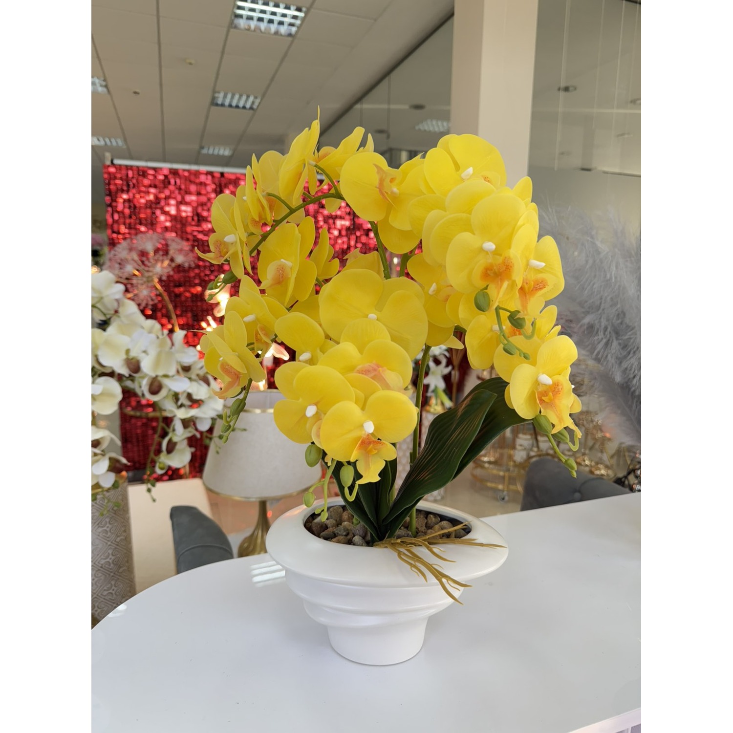 Орхидея в бял цвят с жълта релефна кашпа, 50см