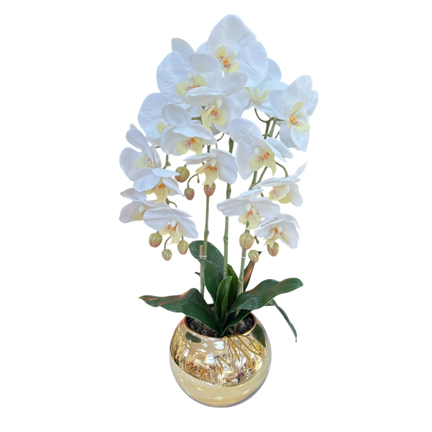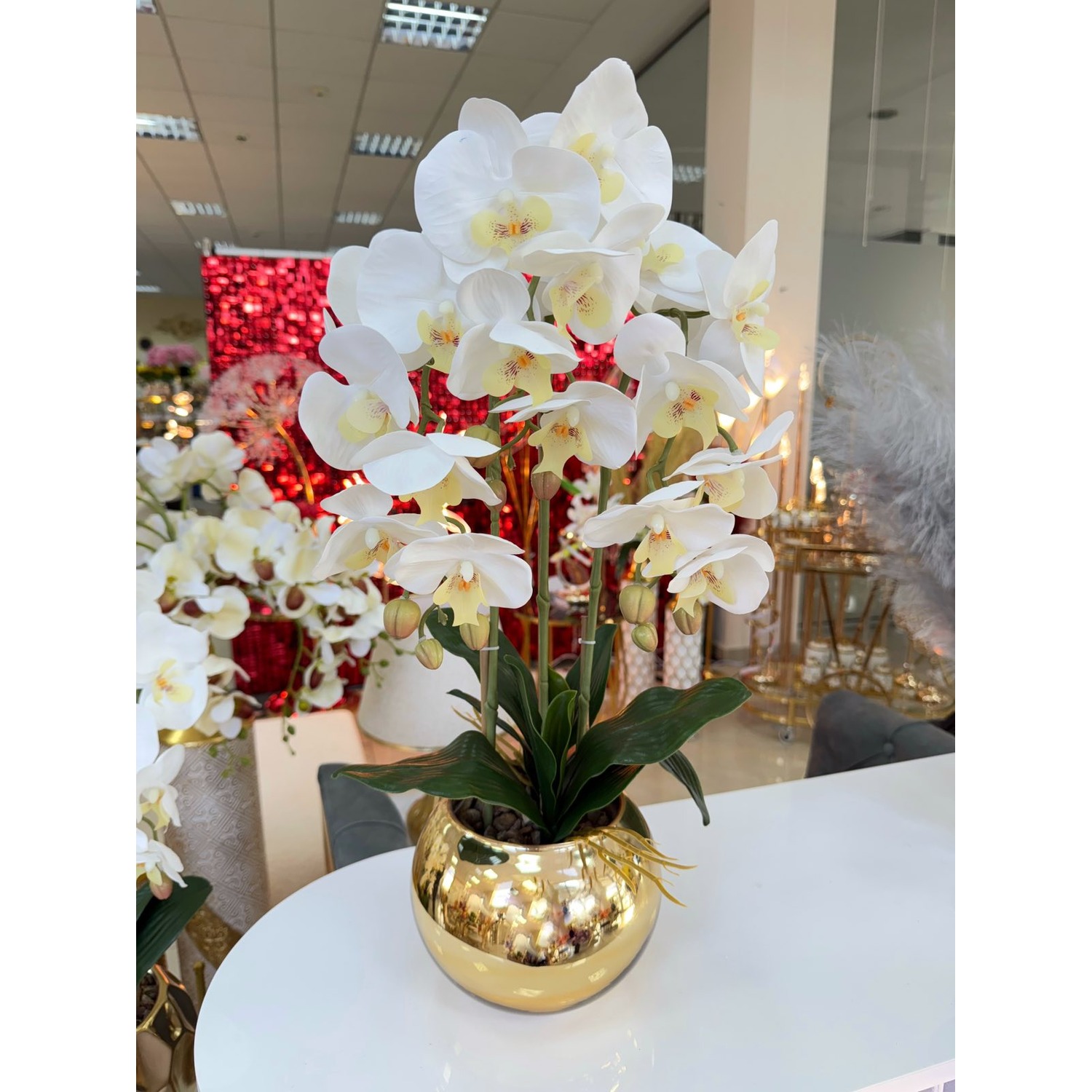 Елегантна изкуствена орхидея висока 55см, в бял цвят с 3 стръка оформена в модерна златна кашпа с релефен дизайн. Идеален акцент за стилна и хармонична атмосфера.