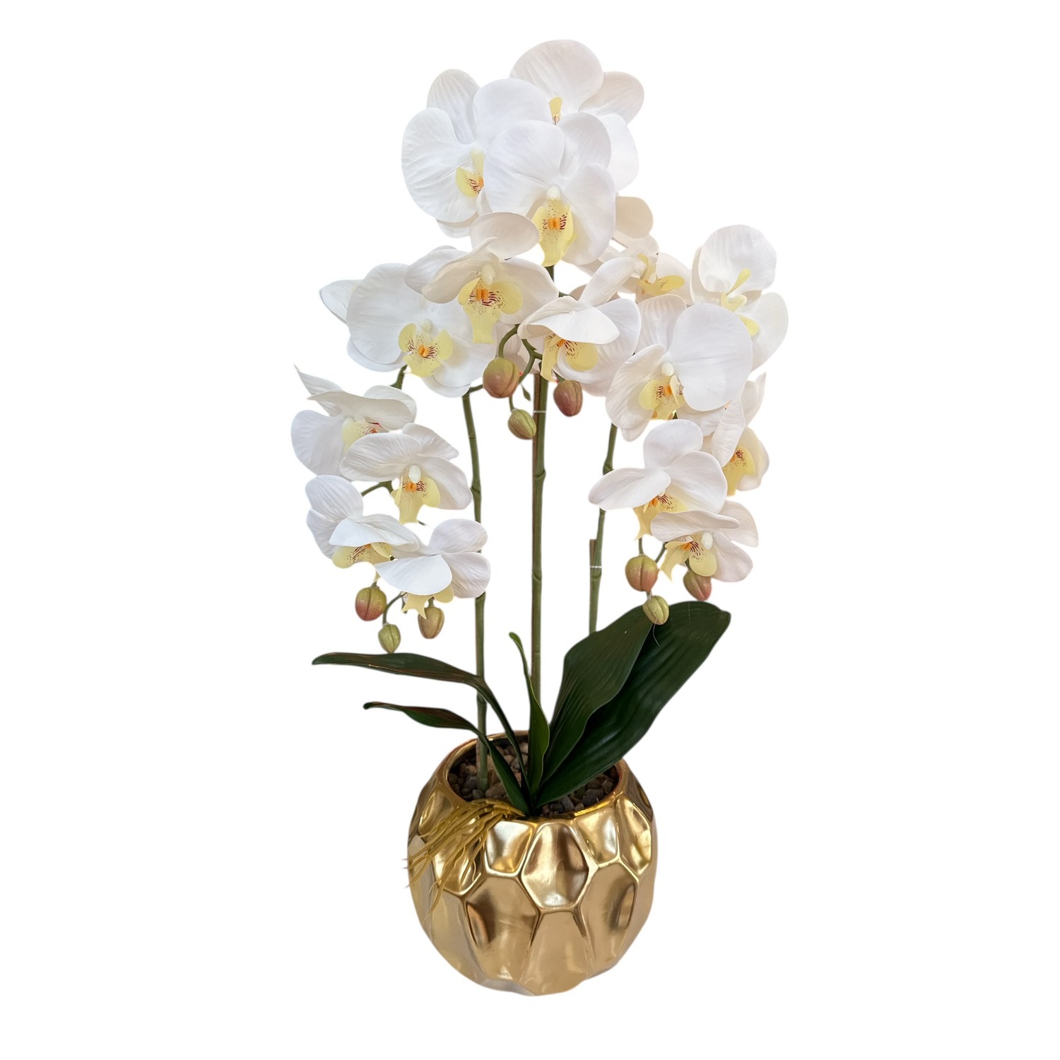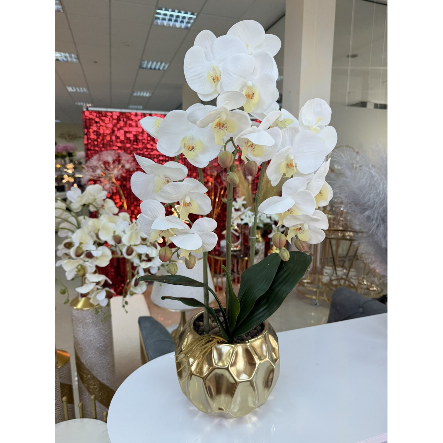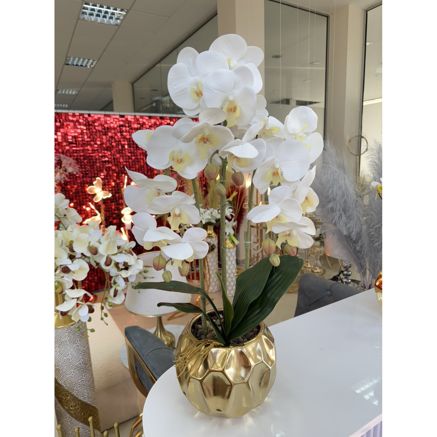 Елегантна изкуствена орхидея в бял цвят с 3 стръка оформена в модерна златна кашпа с релефен дизайн. Идеален акцент за стилна и хармонична атмосфера.