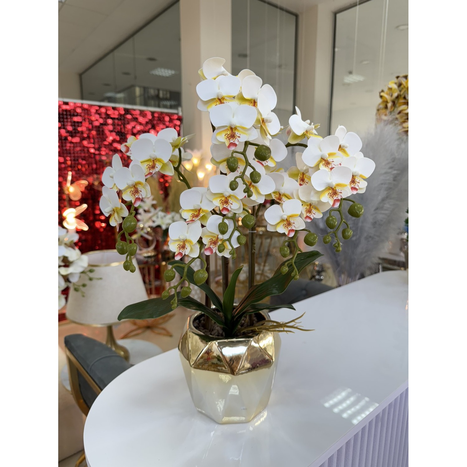 Елегантна изкуствена орхидея в бял цвят с 3 стръка оформена в модерна златна кашпа с релефен дизайн. Идеален акцент за стилна и хармонична атмосфера.
