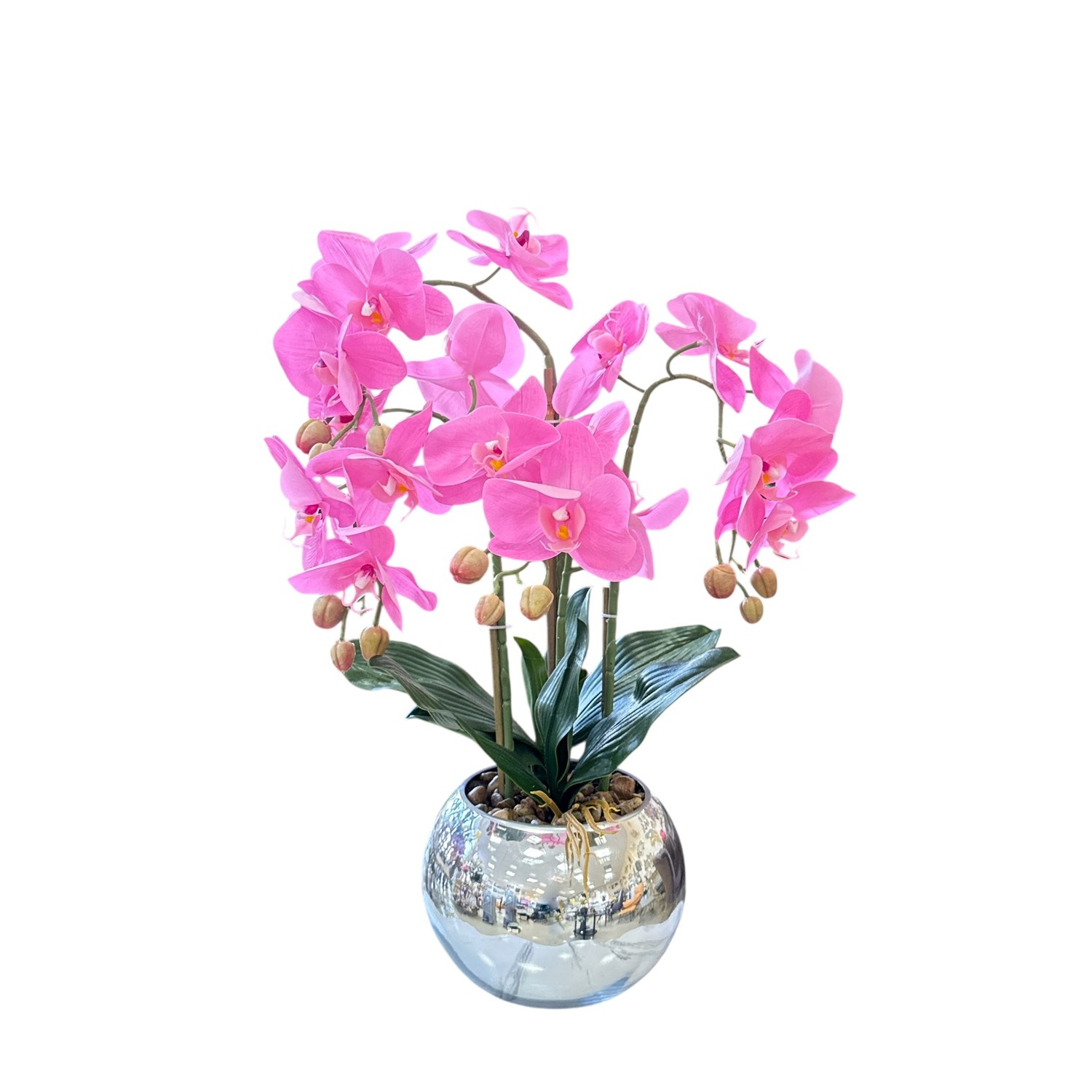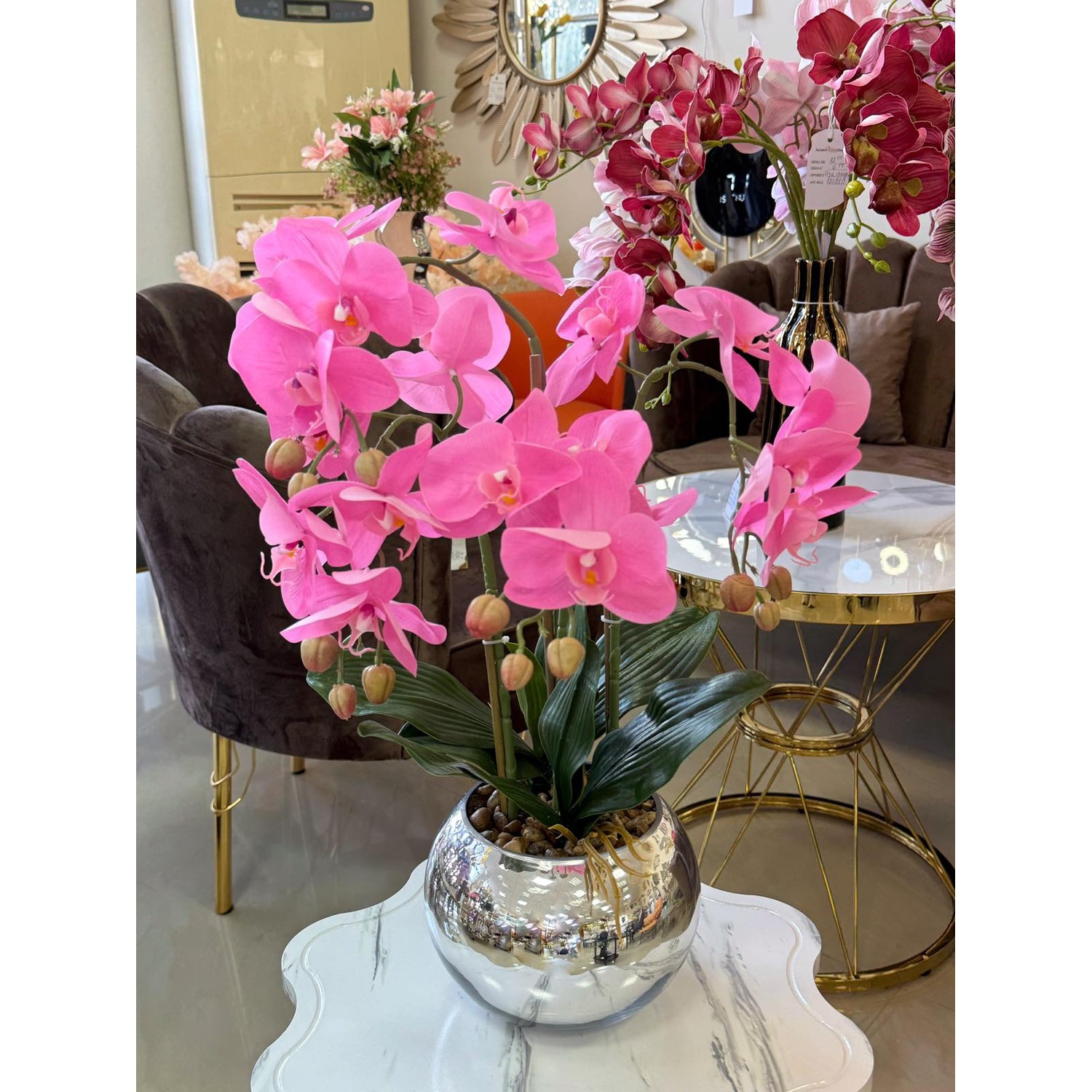 Орхидея в розов цвят със сребърна кашпa, 50см