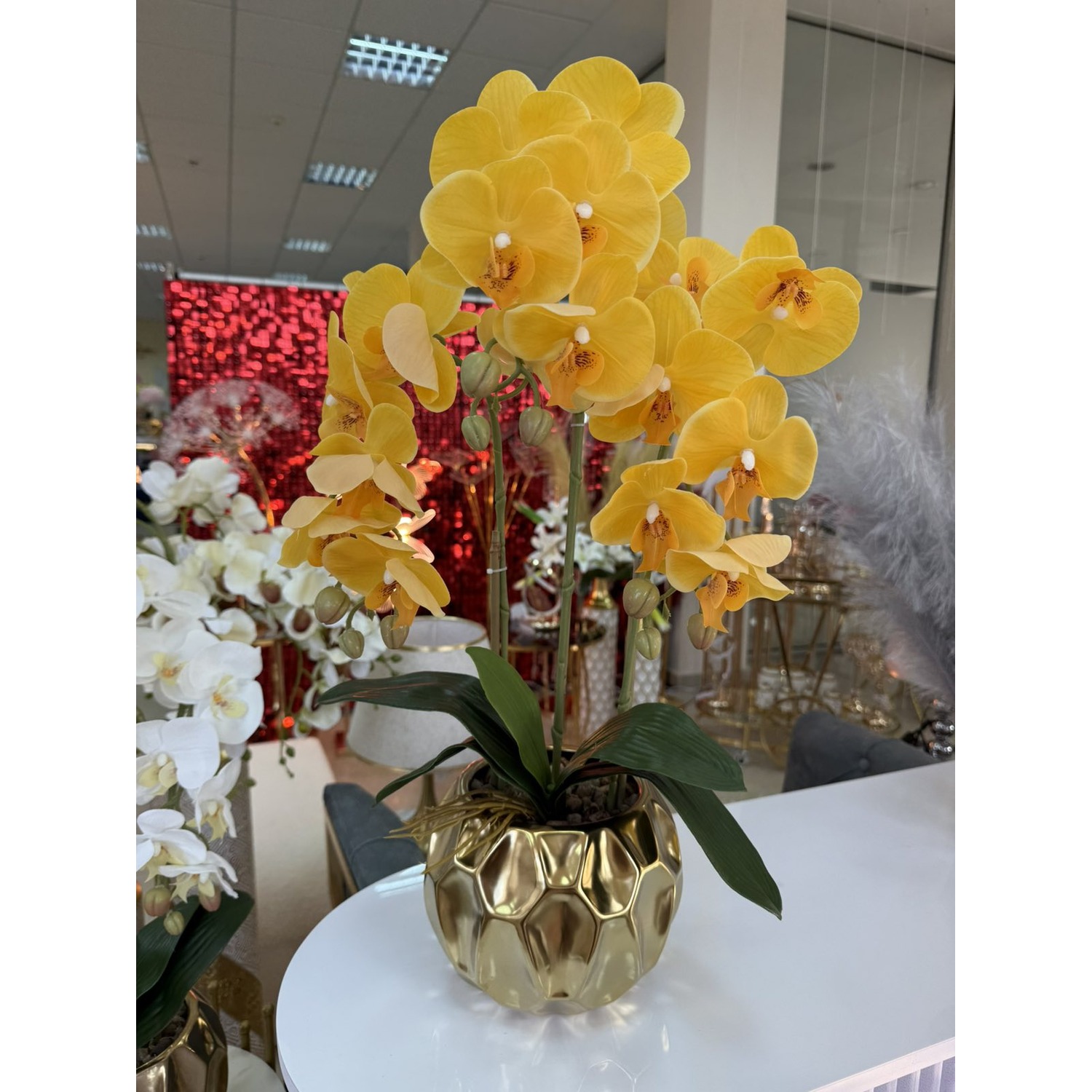 Елегантна изкуствена орхидея в цикламен цвят с 3 стръка оформена в модерна златна кашпа с релефен дизайн. Идеален акцент за стилна и хармонична атмосфера.