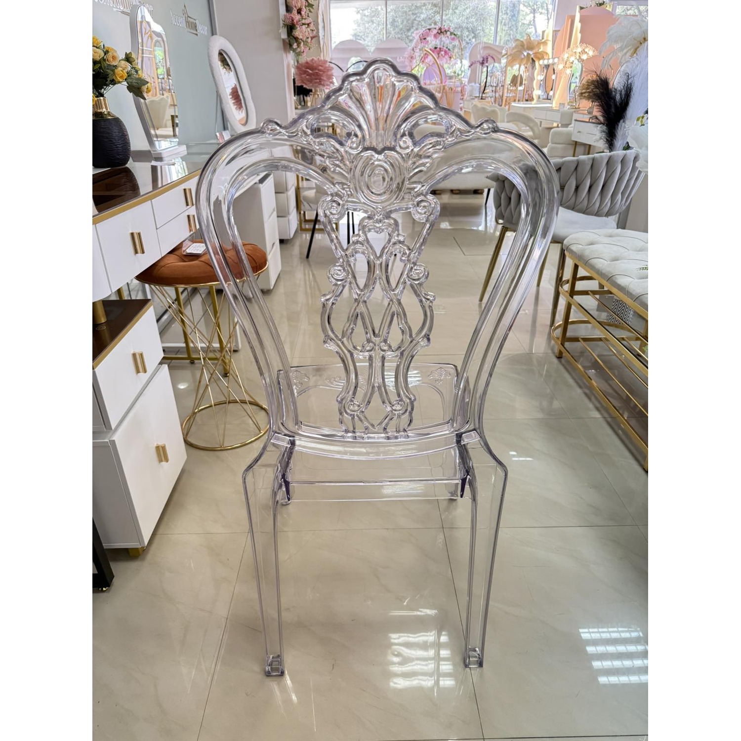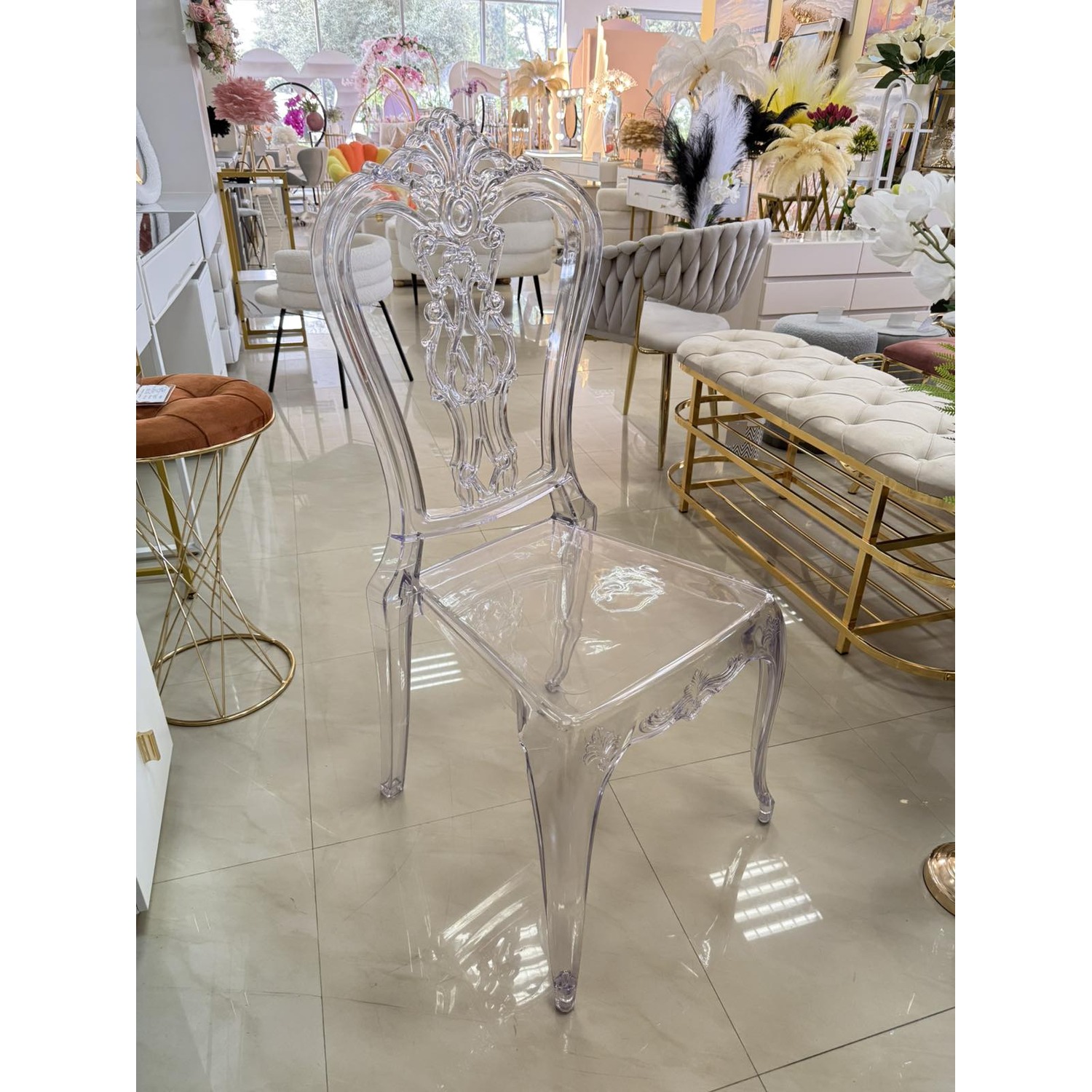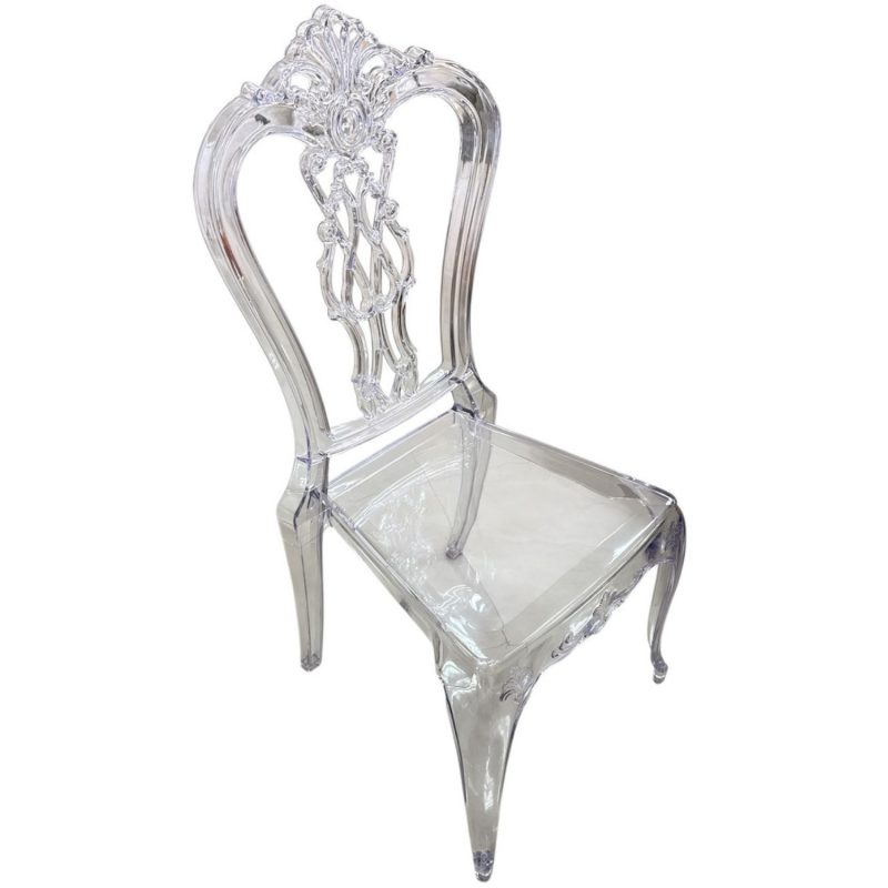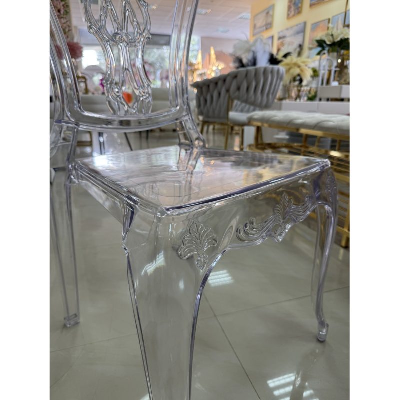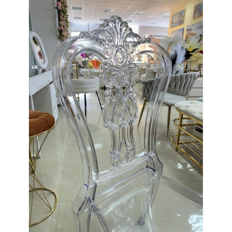 Прозрачен стол с изискан бароков дизайн – стилна и елегантна мебел, която придава лекота и лукс на всяко пространство. Перфектен избор за сватби, събития или модерен интериор.