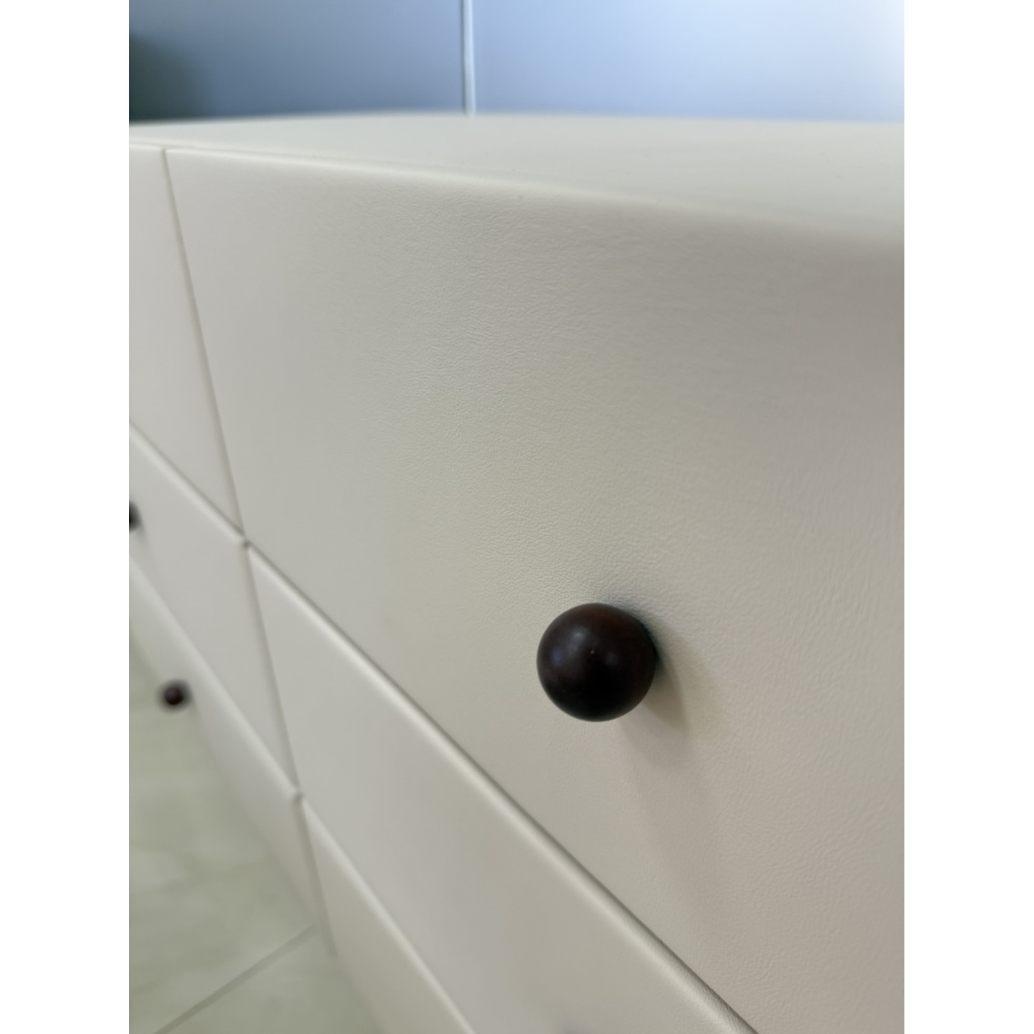 Дамска тоалетка от еко кожа в цвят каки с плот в бял цвят от технически камък с имитация на мрамор. Тоалетката е с 2 чекмеджета, а комодът с 6 и може да се инсталира от ляво или от дясно. Кръглото LED огледало е в бял цвят и е с регулируема светлина, която осигурява идеално осветление за грим и ежедневна грижа.