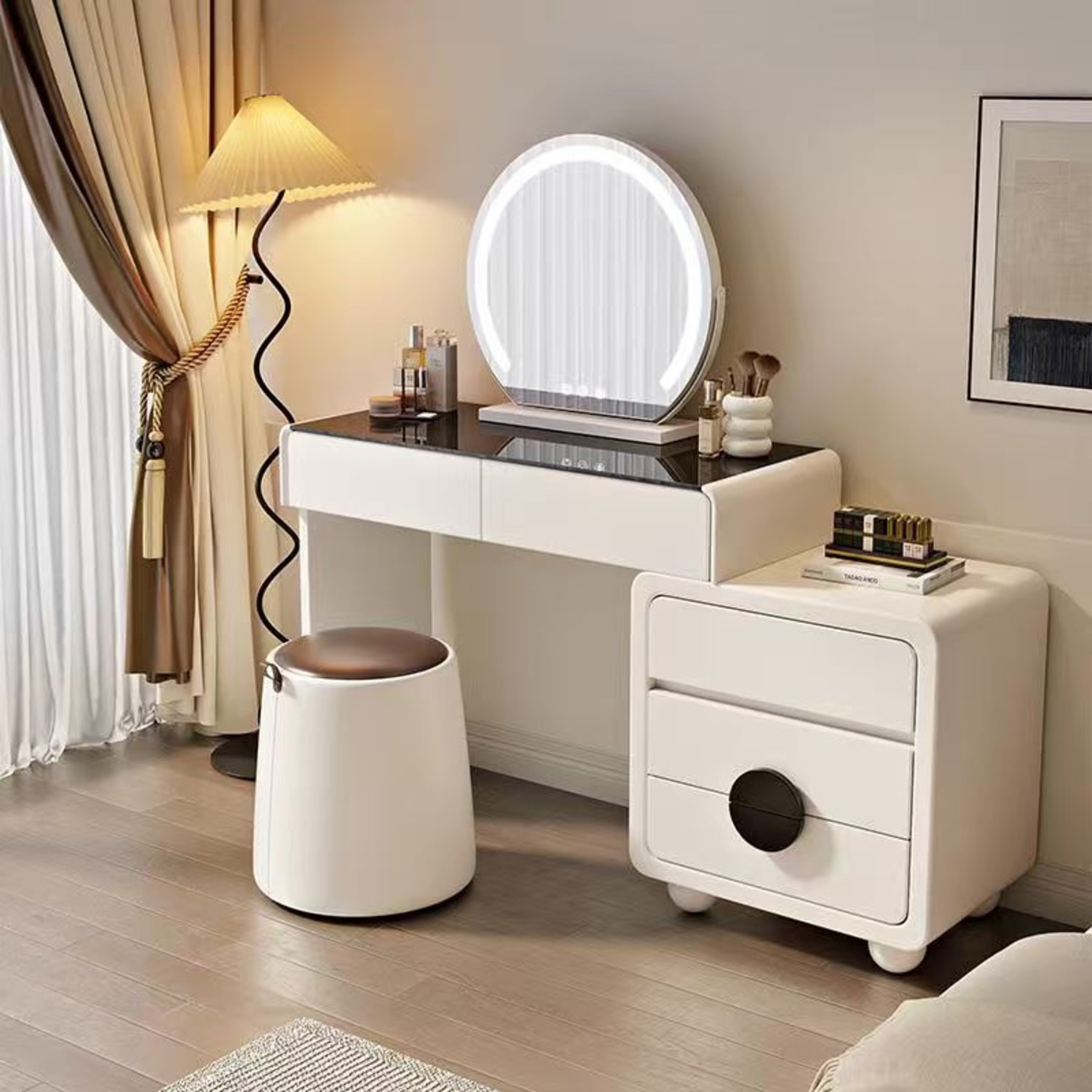 Дамска тоалетка в модерен дизайн в бяла еко кожа и плот от темперирано стъкло в черен цвят. Комплектът включва функционален комод с три дървени чекмеджета с декоративен акцент в черен цвят, придаващ стилна и модерна визия. Кръглото LED огледало е с регулируема светлина, което осигурява удобно осветление за грим и ежедневна грижа. Комодът може да се постави от ляво или от дясно.