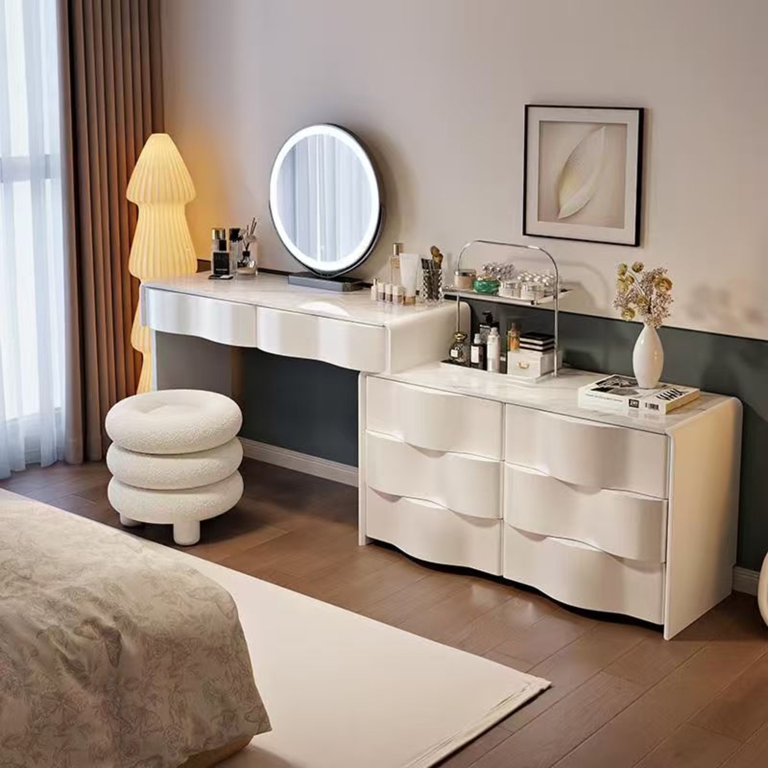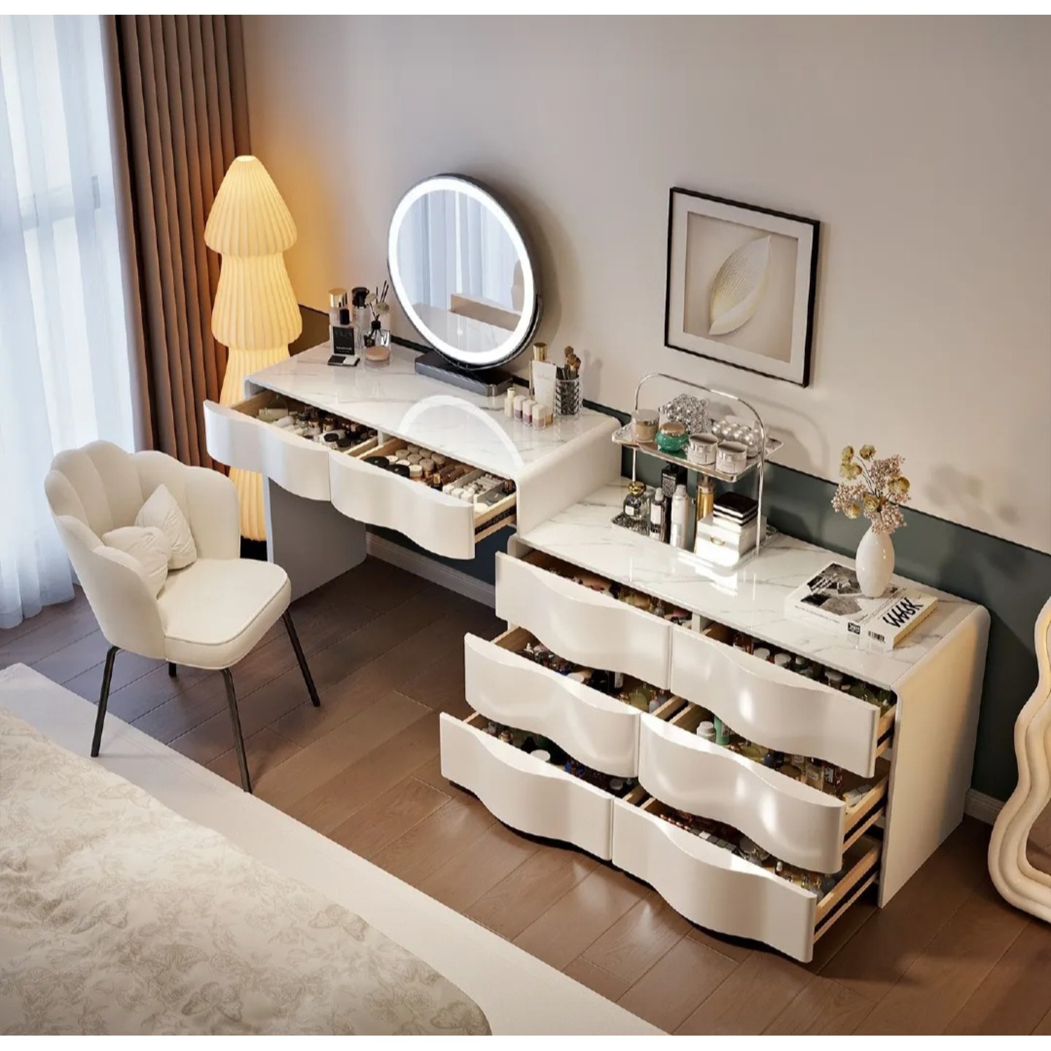 Дамска тоалетка от еко кожа в бял цвят, с плот в бял цвят от технически камък с имитиращи мрамор елементи. Тоалетката е с 2 чекмеджета, а комодът е двоен с 6 чекмеджета и може да се инсталира от ляво или от дясно. Кръглото LED огледало е в черен цвят и е с регулируема светлина, която осигурява идеално осветление за грим и ежедневна грижа.