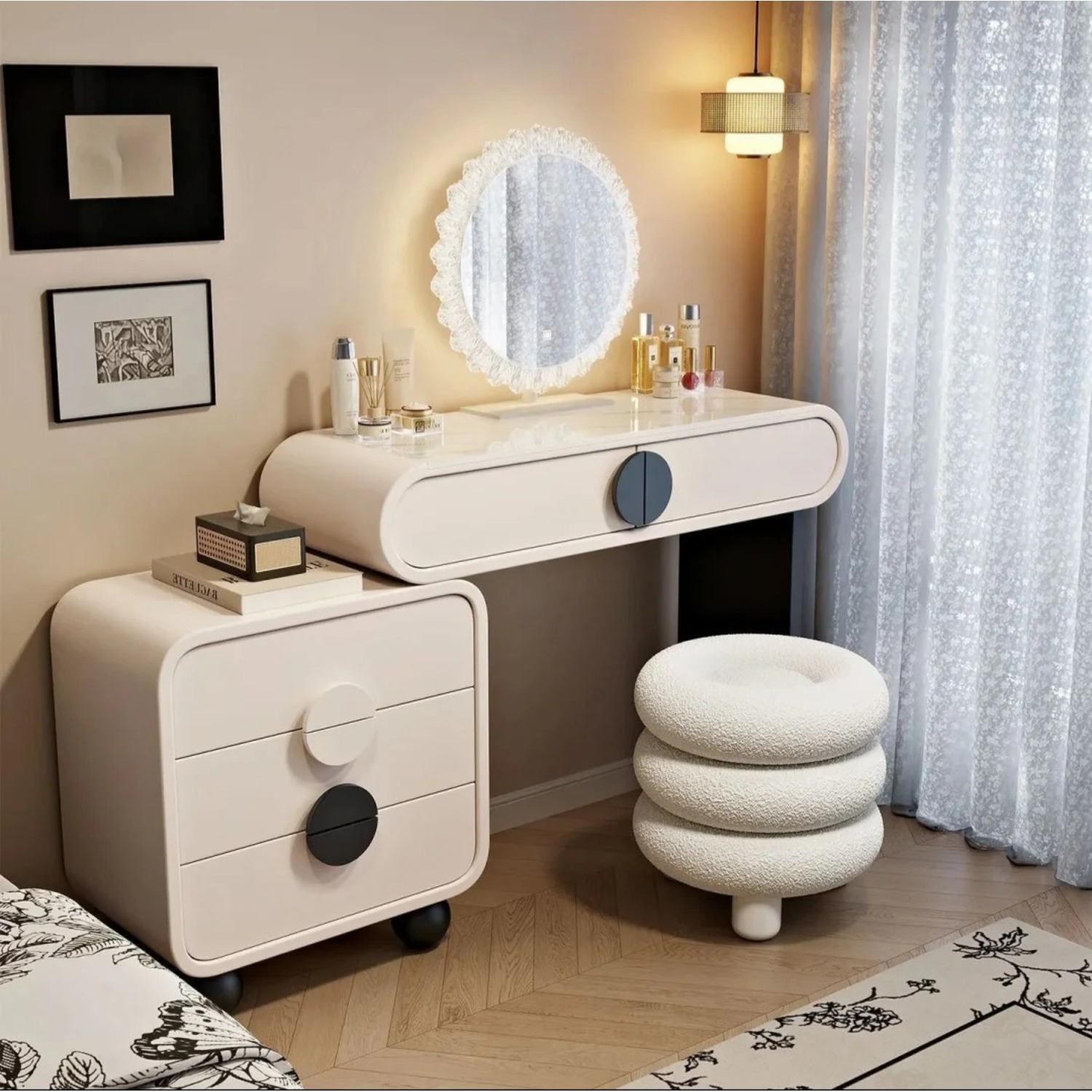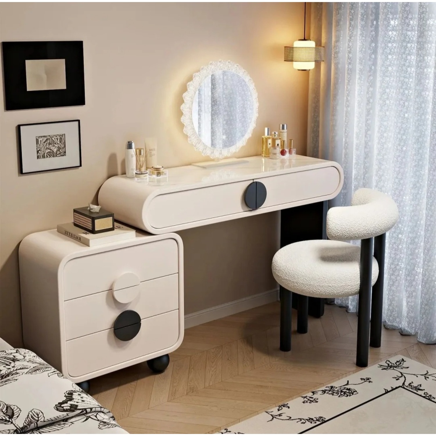 Дамска тоалетка в бял цвят с плот от технически камък и черни акценти при дръжката на чекмеджетата. Тоалетката е с 2 чекмеджета, а комодът с 3, който може да се инсталира от ляво или от дясно. Кръглото LED огледало е в черен цвят и е с регулируема светлина, която осигурява идеално осветление за грим и ежедневна грижа.