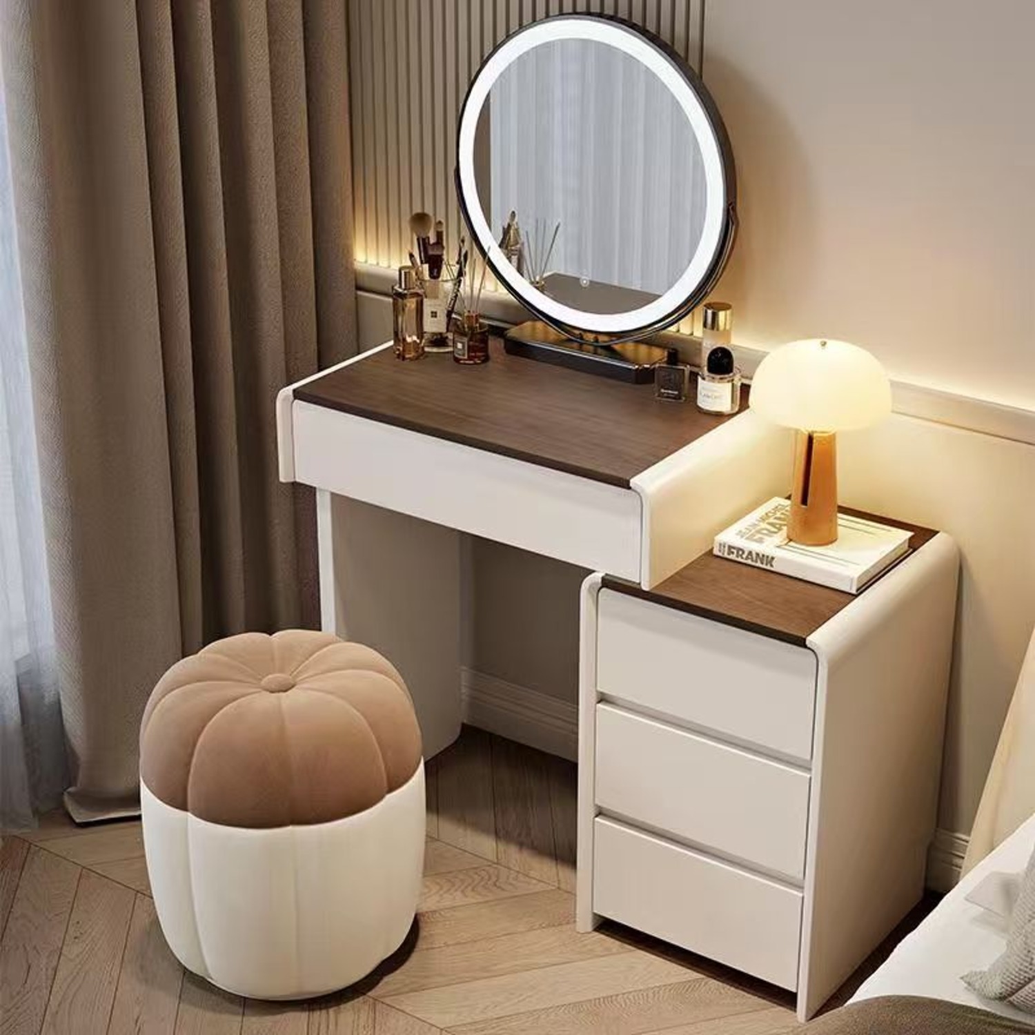 Дамска тоалетка от еко кожа в сив цвят, с плот в тъмнокафяв цвят от дърво. Тоалетката е с 1 чекмедже, а комодът с 3, който може да се инсталира от ляво или от дясно. Кръглото LED огледало е в черен цвят и е с регулируема светлина, която осигурява идеално осветление за грим и ежедневна грижа.