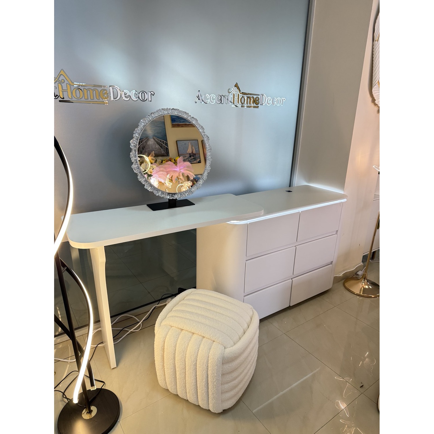Дамска тоалетка е от еко кожа в бял цвят с плот в бял цвят от МДФ. Комодът с 6 чекмеджета и стилна ЛЕД лента в горната част. Може да се инсталира от ляво или от дясно. Кръглото LED огледало е в черен цвят и е с регулируема светлина, която осигурява идеално осветление за грим и ежедневна грижа.