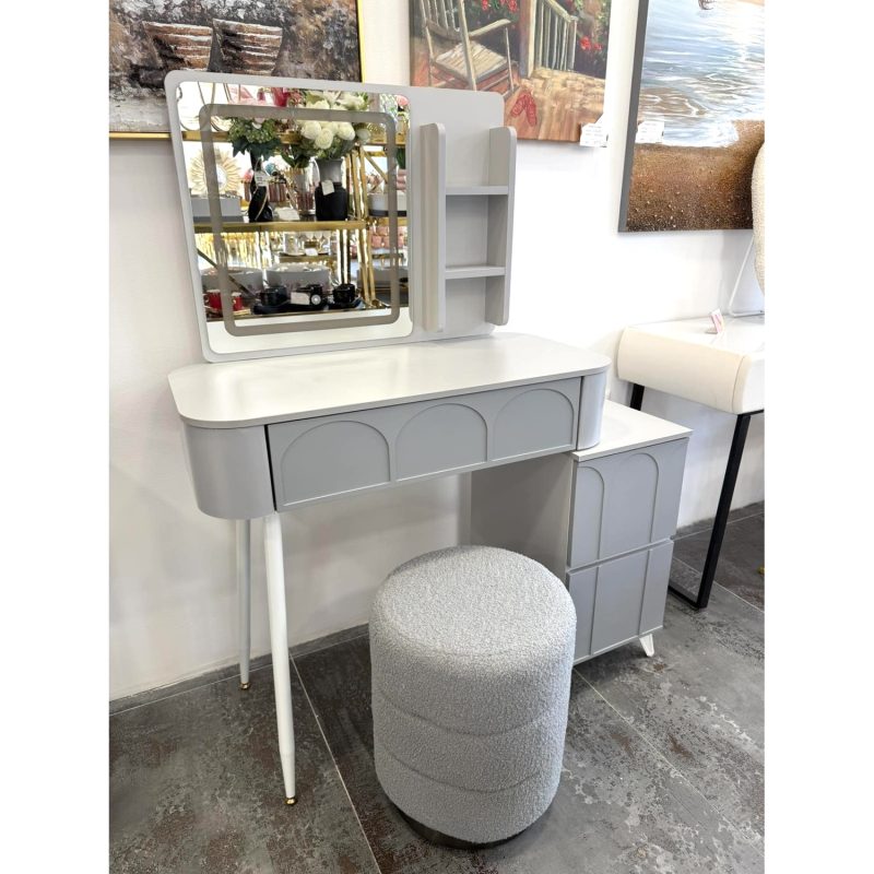 Тоалетка в нежен сив цвят, създадена да внесе изтънченост и уют във всяка спалня.Оборудвана с LED огледало с 3 степени на светлина и практични рафтчета, разположени вдясно, за лесен достъп до любимите козметични продукти и аксесоари. Комбинацията между функционалност и естетика прави тази тоалетка перфектен избор за жени, които ценят организацията, светлината и изисканите форми в интериора си. Към тоалетката е включен комод с 2 чекмеджета, който може да се инсталира от ляво или от дясно.