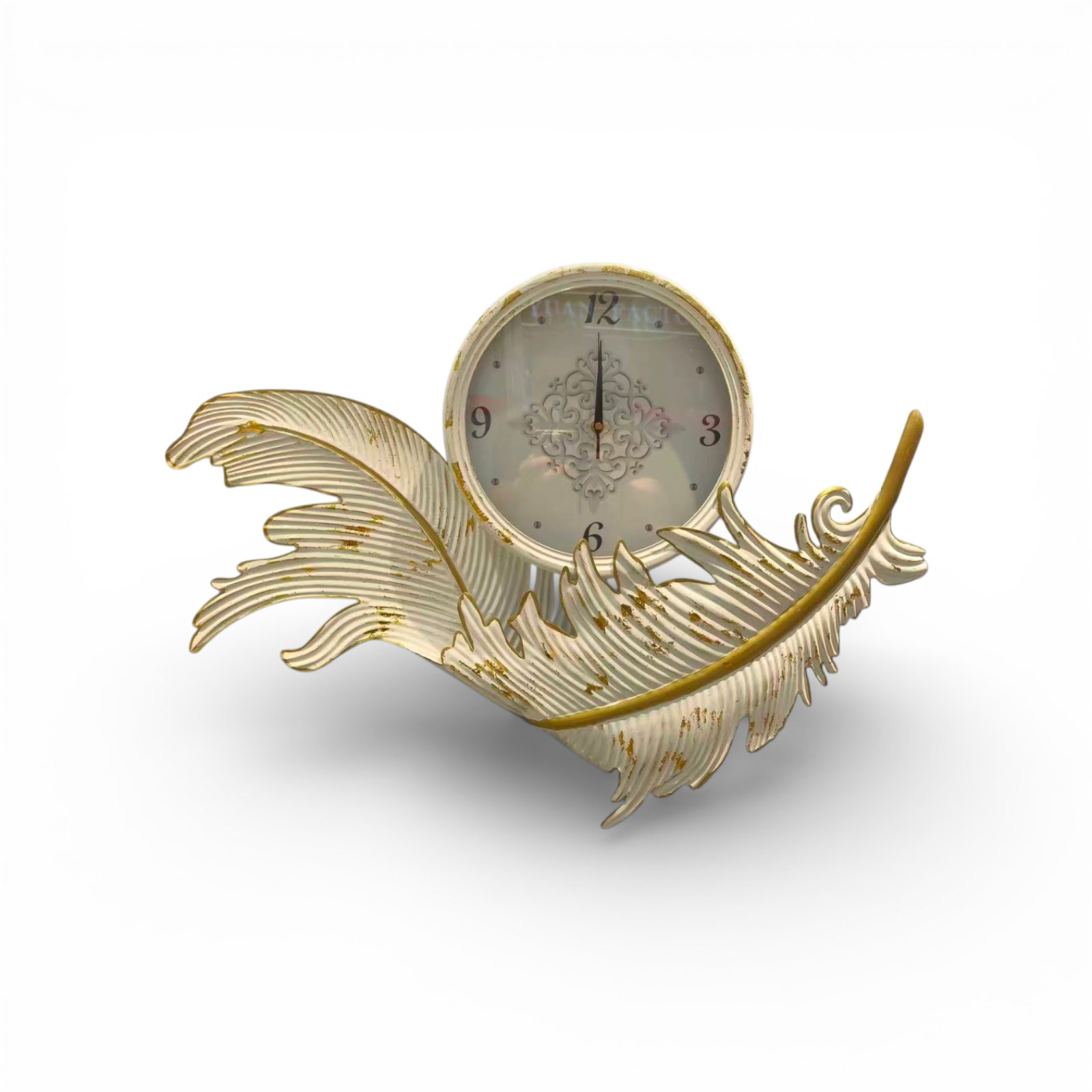 Стилен стенен часовник съчетаващ златист метал и нежни декоративни елементи.