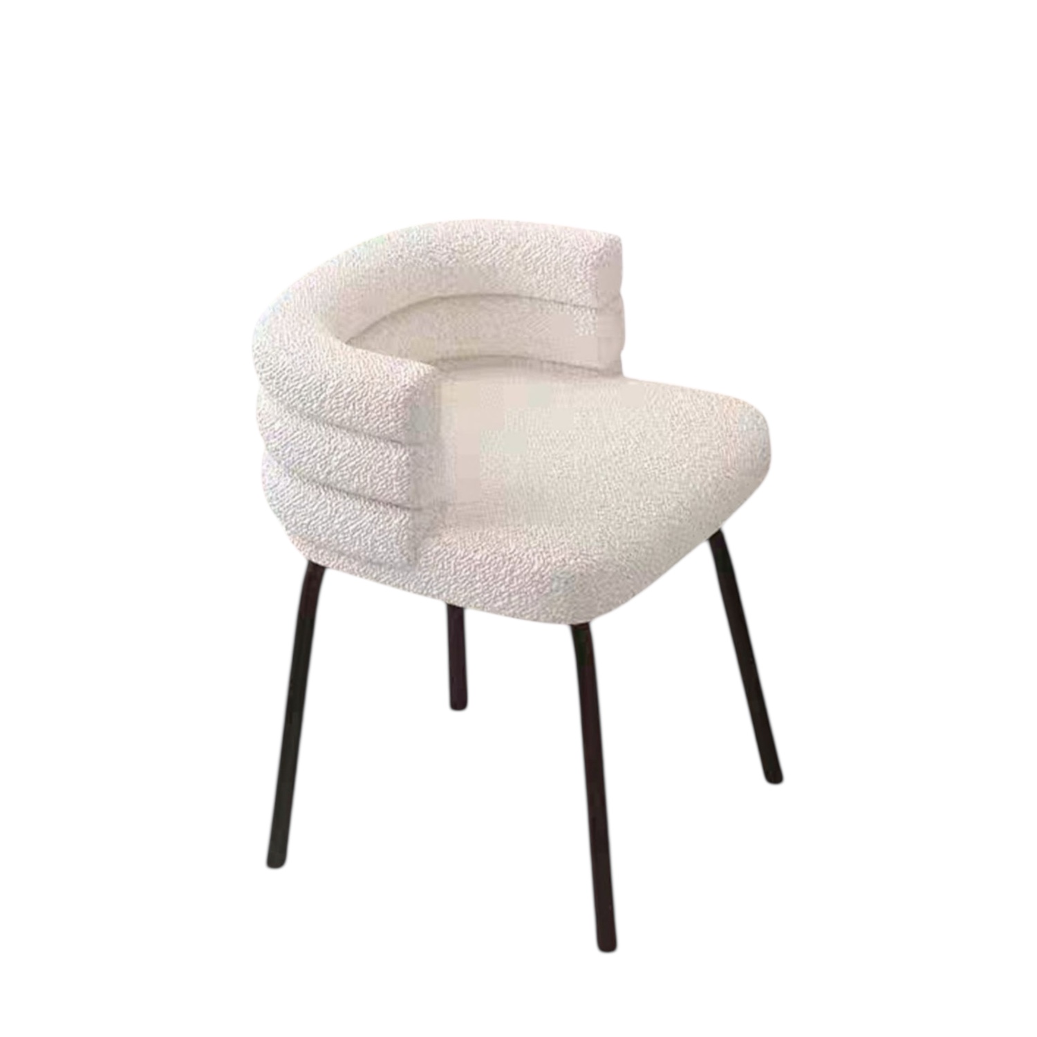 Компактен и стилен стол с изчистен дизайн и букле тапицерия в бял цвят. Ергономичната извита облегалка и стабилните черни крака го правят идеален избор за тоалетка, бюро или кът за четене.
