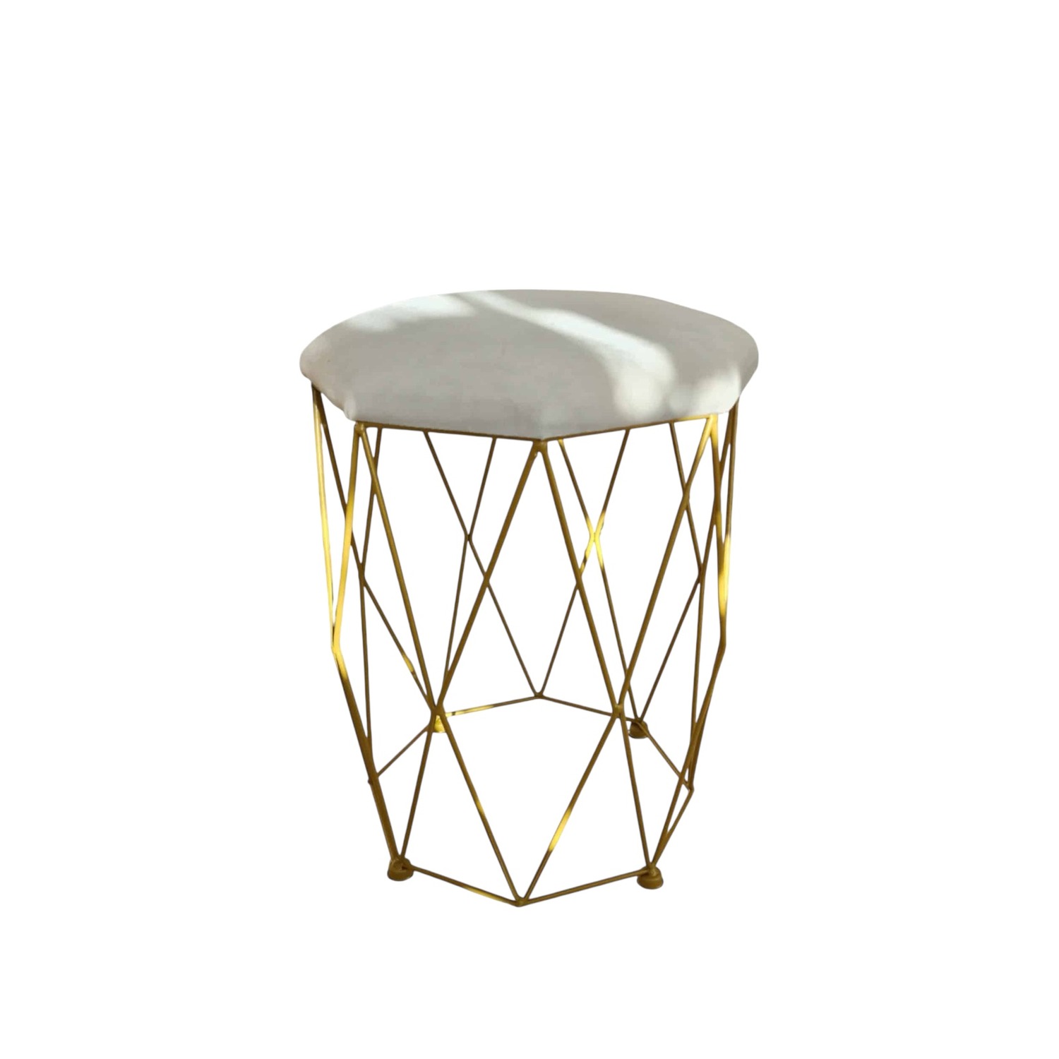 Табуретка с изискани метални крака в златен цвят и кръгла седалка, покрита с мека дамаска в бежов цвят. Тази компактна табуретка е идеална за използване към тоалетка, осигурявайки удобно сядане и добавяйки нотка елегантност към модерното пространство.