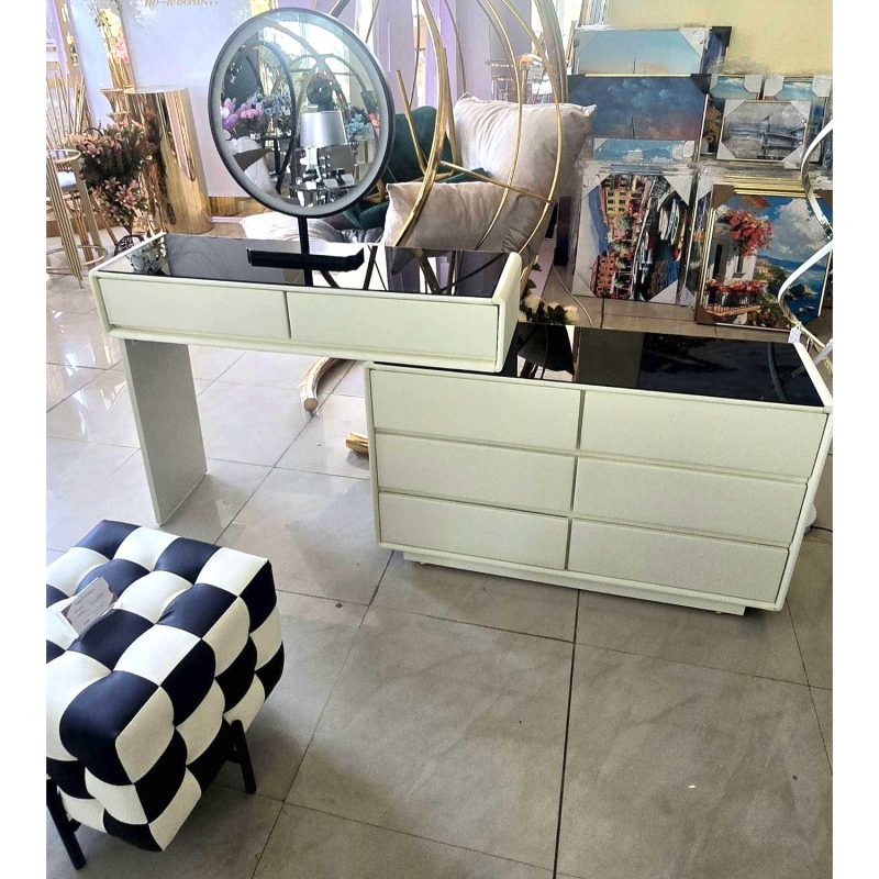 Модерна и стилна дамска тоалетка, която впечатлява. Огледало с LED осветление и черен стъклен плот. Комбинацията между еко кожа в бял цвят и черен плот придава изтънчен и луксозен вид на всяка спалня. Практичните чекмеджета осигуряват достатъчно място за козметика и аксесоари, а включеният комод добавя още функционалност и елегантност.