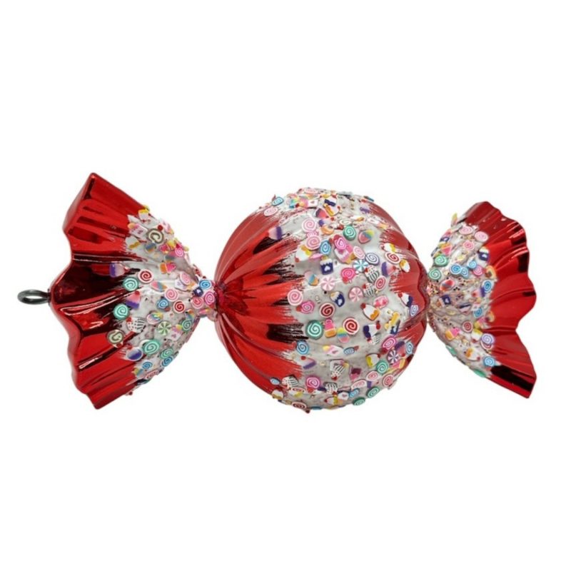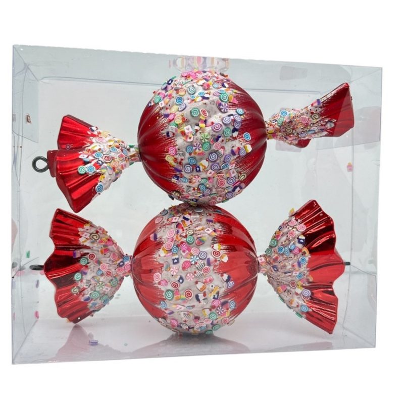 Атрактивен комплект от две коледни играчки във формата на бонбони с гланцирано червено покритие и цветни захарни мотиви. Придават игрив и празничен акцент на елхата.